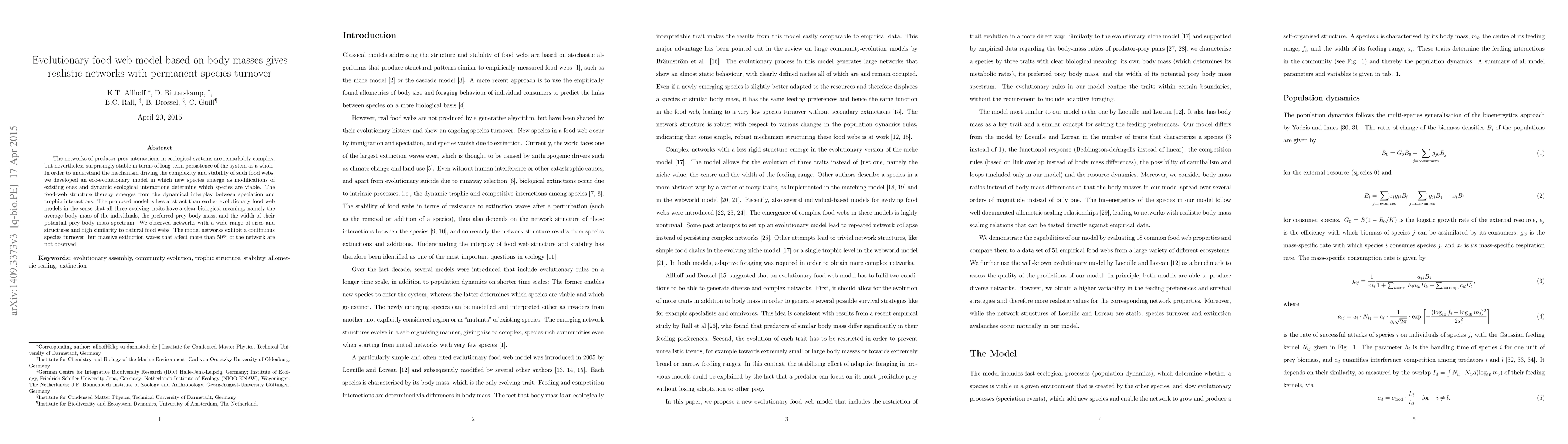 This paper presents an eco-evolutionary model that generates realistic food web networks through the evolution of species based on body mass traits, showing stable complexity and continuous species turnover without massive extinction waves. The model's networks closely resemble natural food webs in terms of structure and size.
