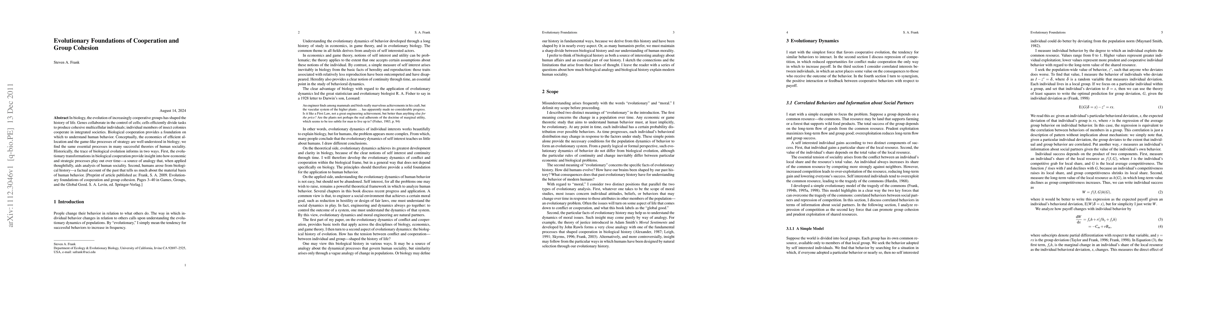 In biology, the evolution of increasingly cooperative groups has shaped the history of life. Genes collaborate in the control of cells; cells efficiently divide tasks to produce cohesive multicellular individuals; individual members of insect colonies cooperate in integrated societies. Biological cooperation provides a foundation on which to understand human behavior. Conceptually, the economics of efficient allocation and the game-like processes of strategy are well understood in biology; we find the same essential processes in many successful theories of human sociality. Historically, the trace of biological evolution informs in two ways. First, the evolutionary transformations in biological cooperation provide insight into how economic and strategic processes play out over time--a source of analogy that, when applied thoughtfully, aids analysis of human sociality. Second, humans arose from biological history--a factual account of the past that tells us much about the material basis of human behavior.