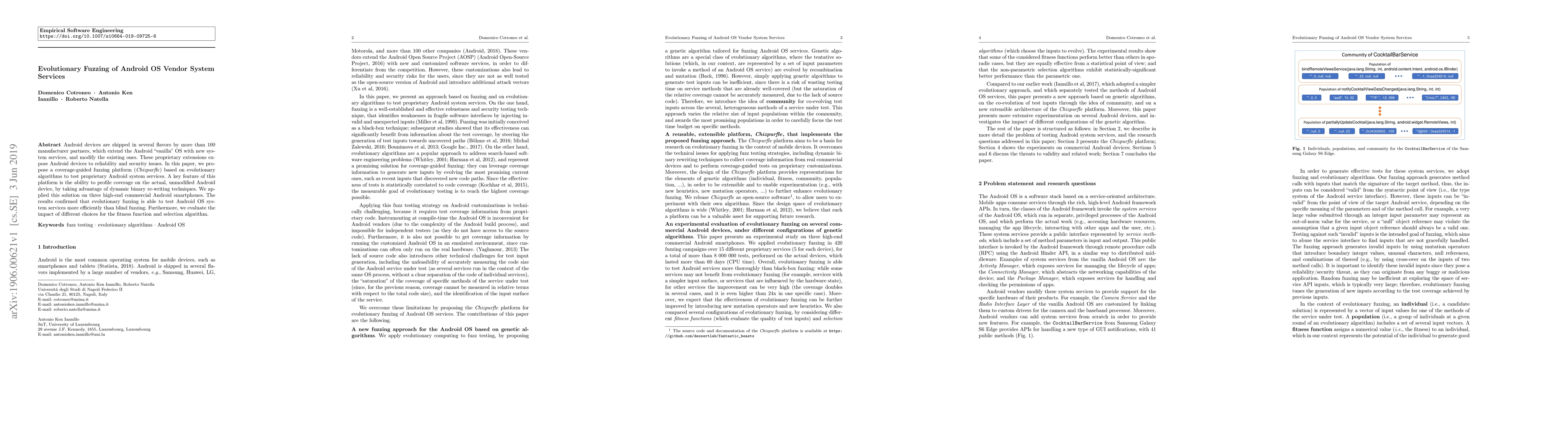 This paper introduces Chizpurfle, an evolutionary fuzzing platform for testing proprietary Android system services, leveraging dynamic binary re-writing for coverage profiling. Results show that it outperforms traditional fuzzing methods, and the study evaluates various fitness functions and selection algorithms for optimal performance.