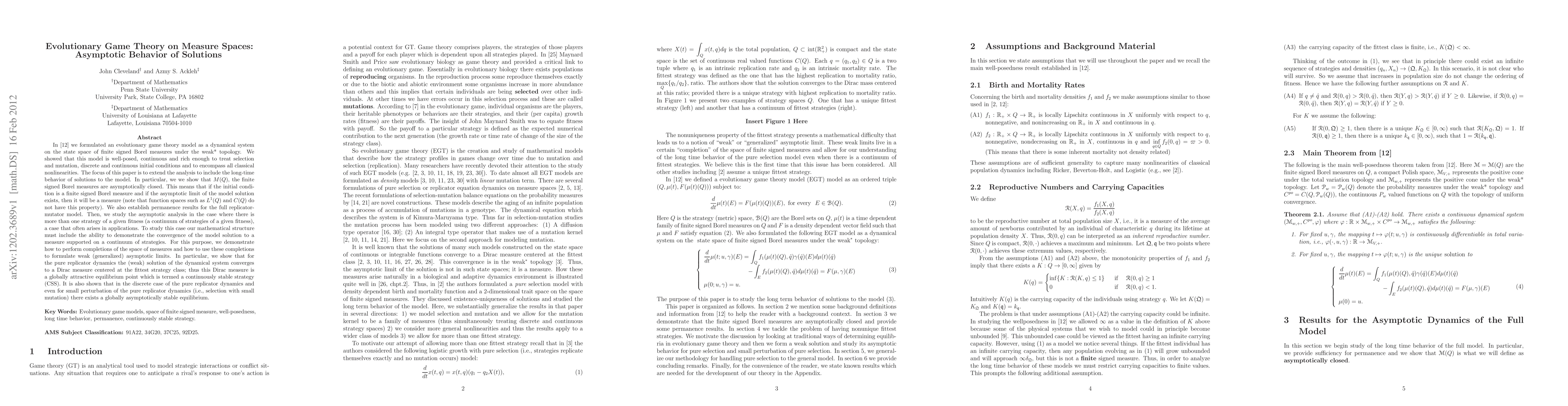 In [12] we formulated an evolutionary game theory model as a dynamical system on the state space of finite signed Borel measures under the weak* topology. The focus of this paper is to extend the analysis to include the long-time behavior of solutions to the model. In particular, we show that M(Q), the finite signed Borel measures are asymptotically closed. This means that if the initial condition is a finite signed Borel measure and if the asymptotic limit of the model solution exists, then it will be a measure (note that function spaces such as L1(Q) and C(Q) do not have this property). We also establish permanence results for the full replicator mutator model. Then, we study the asymptotic analysis in the case where there is more than one strategy of a given fitness (a continuum of strategies of a given fitness), a case that often arises in applications. To study this case our mathematical structure must include the ability to demonstrate the convergence of the model solution to a measure supported on a continuum of strategies. For this purpose, we demonstrate how to perform completions of the space of measures and how to use these completions to formulate weak (generalized) asymptotic limits. In particular, we show that for the pure replicator dynamics the (weak) solution of the dynamical system converges to a Dirac measure centered at the fittest strategy class; thus this Dirac measure is a globally attractive equilibrium point which is termed a continuously stable strategy (CSS). It is also shown that in the discrete case of the pure replicator dynamics and even for small perturbation of the pure replicator dynamics (i.e., selection with small mutation) there exists a globally asymptotically stable equilibrium.