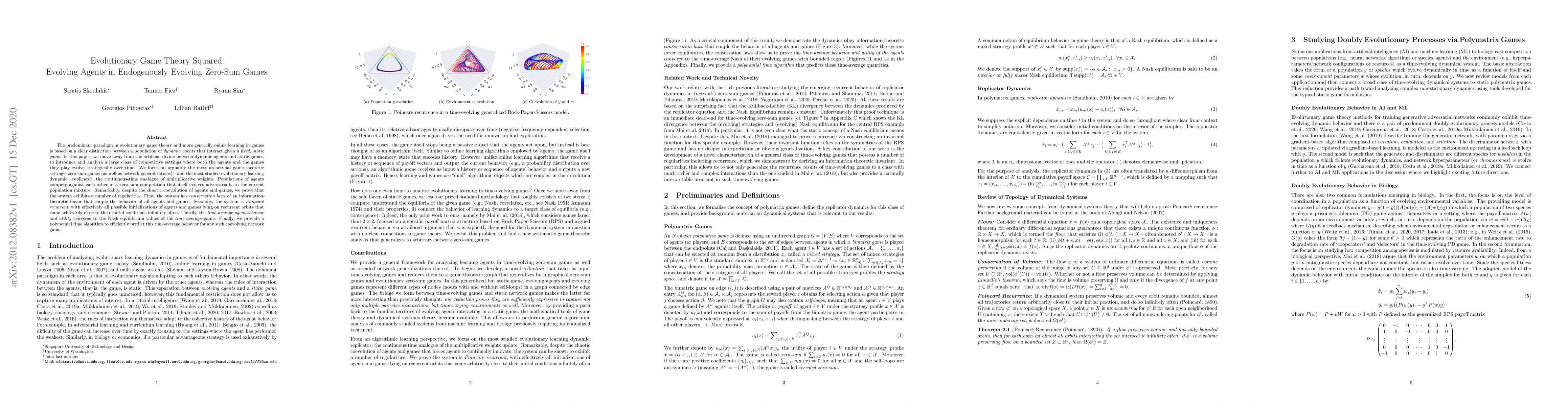 This paper explores a novel framework where both agents and zero-sum games evolve dynamically, challenging traditional static game theory. It demonstrates that despite the complex coevolution, the system maintains conservation laws, Poincaré recurrence, and converges to Nash equilibrium, with an efficient algorithm for predicting long-term behavior.