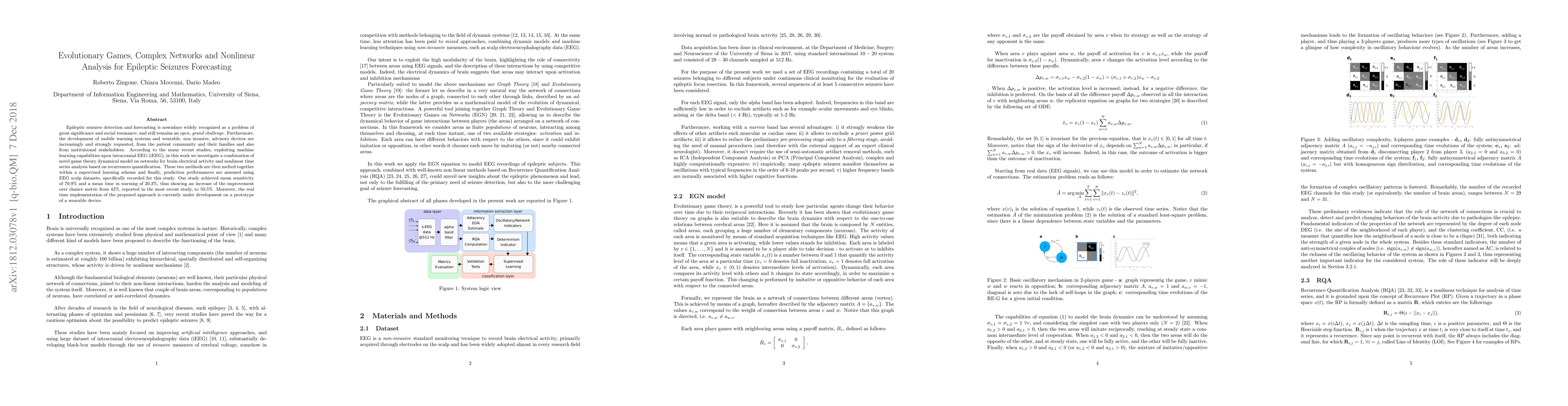 Epileptic seizures detection and forecasting is nowadays widely recognized as a problem of great significance and social resonance, and still remains an open, grand challenge. Furthermore, the development of mobile warning systems and wearable, non invasive, advisory devices are increasingly and strongly requested, from the patient community and their families and also from institutional stakeholders. According to the many recent studies, exploiting machine learning capabilities upon intracranial EEG (iEEG), in this work we investigate a combination of novel game theory dynamical model on networks for brain electrical activity and nonlinear time series analysis based on recurrences quantification. These two methods are then melted together within a supervised learning scheme and finally, prediction performances are assessed using EEG scalp datasets, specifically recorded for this study. Our study achieved mean sensitivity of 70.9% and a mean time in warning of 20.3%, thus showing an increase of the improvement over chance metric from 42%, reported in the most recent study, to 50.5%. Moreover, the real time implementation of the proposed approach is currently under development on a prototype of a wearable device.