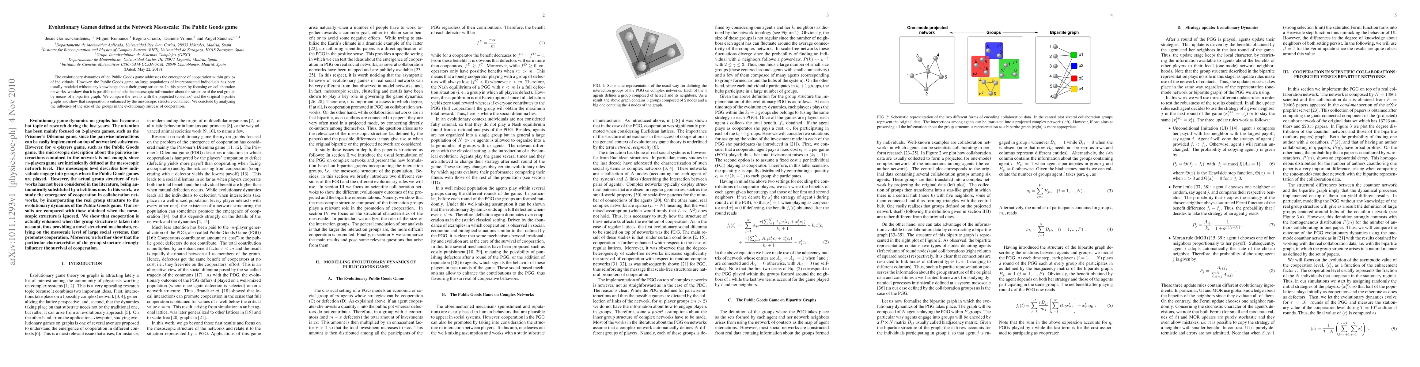 The evolutionary dynamics of the Public Goods game addresses the emergence of cooperation within groups of individuals. However, the Public Goods game on large populations of interconnected individuals has been usually modeled without any knowledge about their group structure. In this paper, by focusing on collaboration networks, we show that it is possible to include the mesoscopic information about the structure of the real groups by means of a bipartite graph. We compare the results with the projected (coauthor) and the original bipartite graphs and show that cooperation is enhanced by the mesoscopic structure contained. We conclude by analyzing the influence of the size of the groups in the evolutionary success of cooperation.