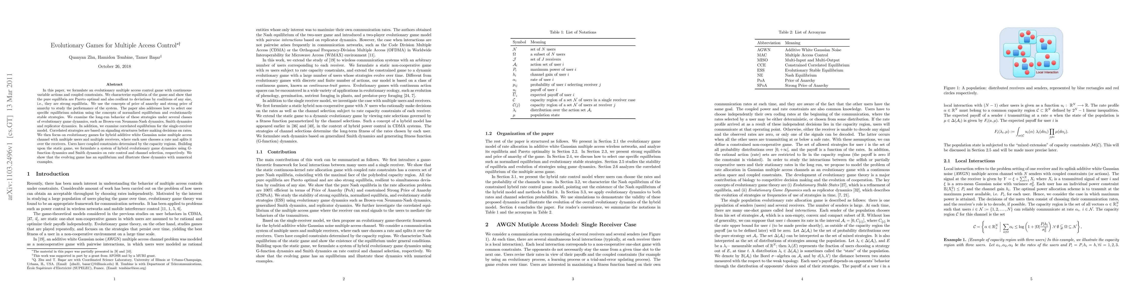 In this paper, we formulate an evolutionarymultiple access control game with continuousvariable actions and coupled constraints. We characterize equilibria of the game and show that the pure equilibria are Pareto optimal and also resilient to deviations by coalitions of any size, i.e., they are strong equilibria. We use the concepts of price of anarchy and strong price of anarchy to study the performance of the system. The paper also addresses how to select one specific equilibrium solution using the concepts of normalized equilibrium and evolutionarily stable strategies. We examine the long-run behavior of these strategies under several classes of evolutionary game dynamics, such as Brown-von Neumann-Nash dynamics, Smith dynamics and replicator dynamics. In addition, we examine correlated equilibrium for the single-receiver model. Correlated strategies are based on signaling structures before making decisions on rates. We then focus on evolutionary games for hybrid additive white Gaussian noise multiple access channel with multiple users and multiple receivers, where each user chooses a rate and splits it over the receivers. Users have coupled constraints determined by the capacity regions. Building upon the static game, we formulate a system of hybrid evolutionary game dynamics using G-function dynamics and Smith dynamics on rate control and channel selection, respectively. We show that the evolving game has an equilibrium and illustrate these dynamics with numerical examples.