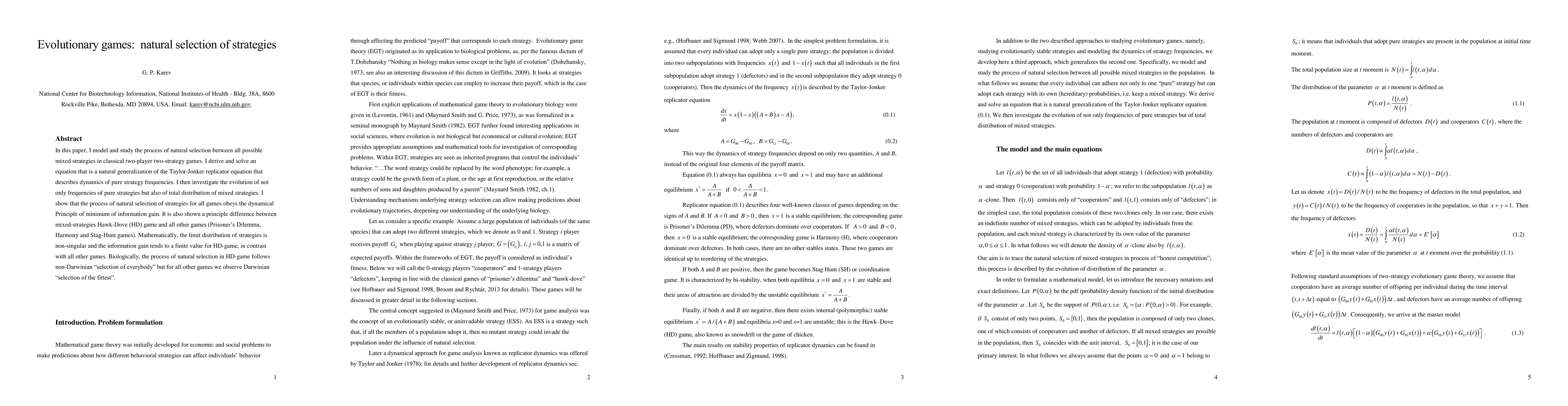 This paper models natural selection in two-player games, deriving a generalized replicator equation for mixed strategies and demonstrating the principle of minimum information gain in strategy evolution. It explores the dynamics of both pure and mixed strategy distributions.