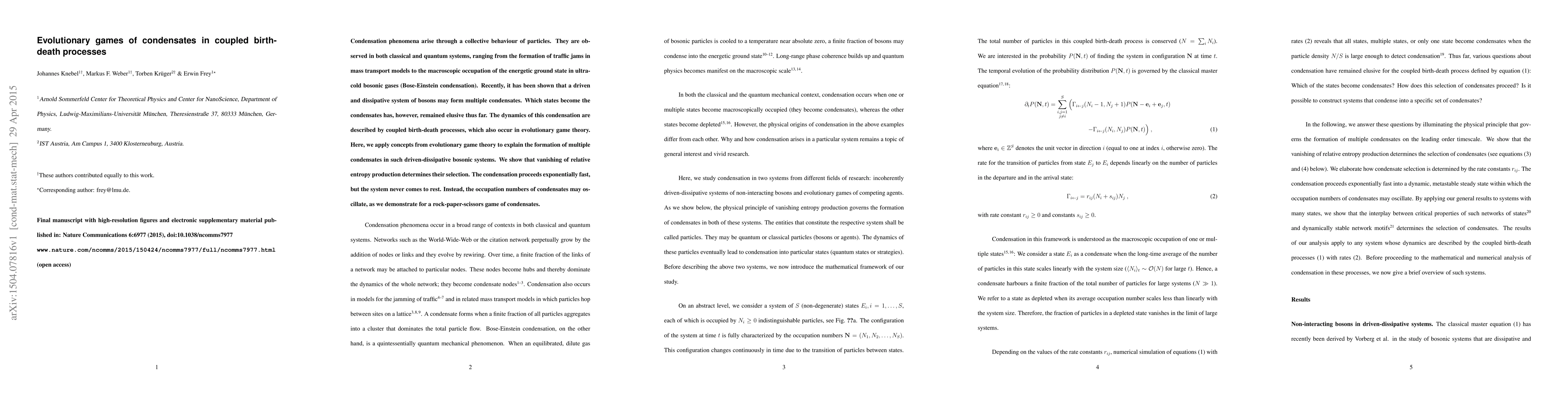 Condensation phenomena arise through a collective behaviour of particles. They are observed in both classical and quantum systems, ranging from the formation of traffic jams in mass transport models to the macroscopic occupation of the energetic ground state in ultra-cold bosonic gases (Bose-Einstein condensation). Recently, it has been shown that a driven and dissipative system of bosons may form multiple condensates. Which states become the condensates has, however, remained elusive thus far. The dynamics of this condensation are described by coupled birth-death processes, which also occur in evolutionary game theory. Here, we apply concepts from evolutionary game theory to explain the formation of multiple condensates in such driven-dissipative bosonic systems. We show that vanishing of relative entropy production determines their selection. The condensation proceeds exponentially fast, but the system never comes to rest. Instead, the occupation numbers of condensates may oscillate, as we demonstrate for a rock-paper-scissors game of condensates.