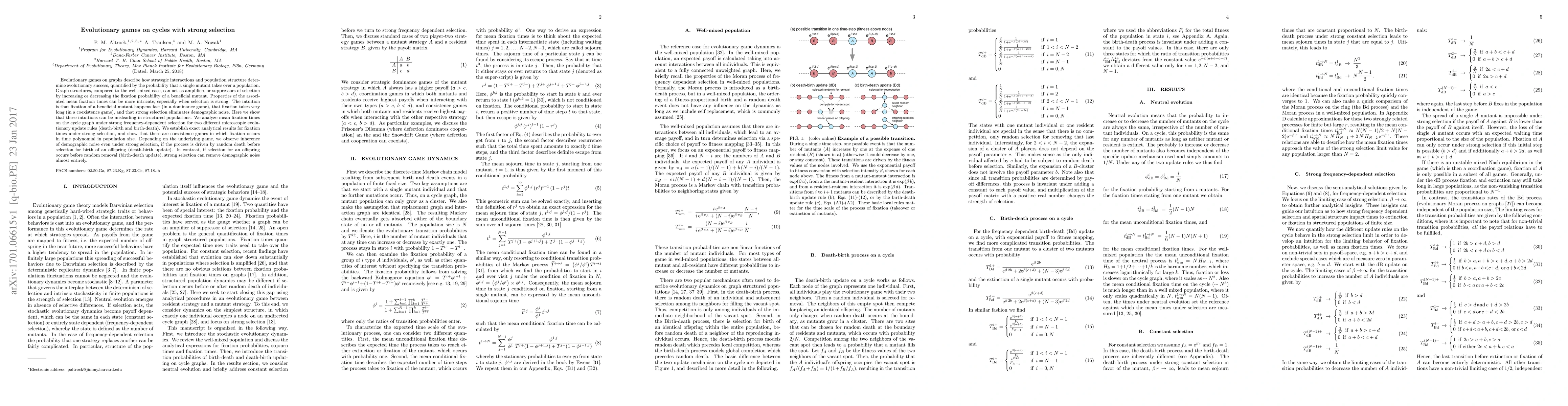 This paper investigates evolutionary games on cycle graphs under strong selection, revealing that fixation times and the influence of demographic noise can be more complex than expected. It finds that strong selection does not always eliminate demographic noise, especially under death-birth update rules, while birth-death updates can nearly eliminate such noise.