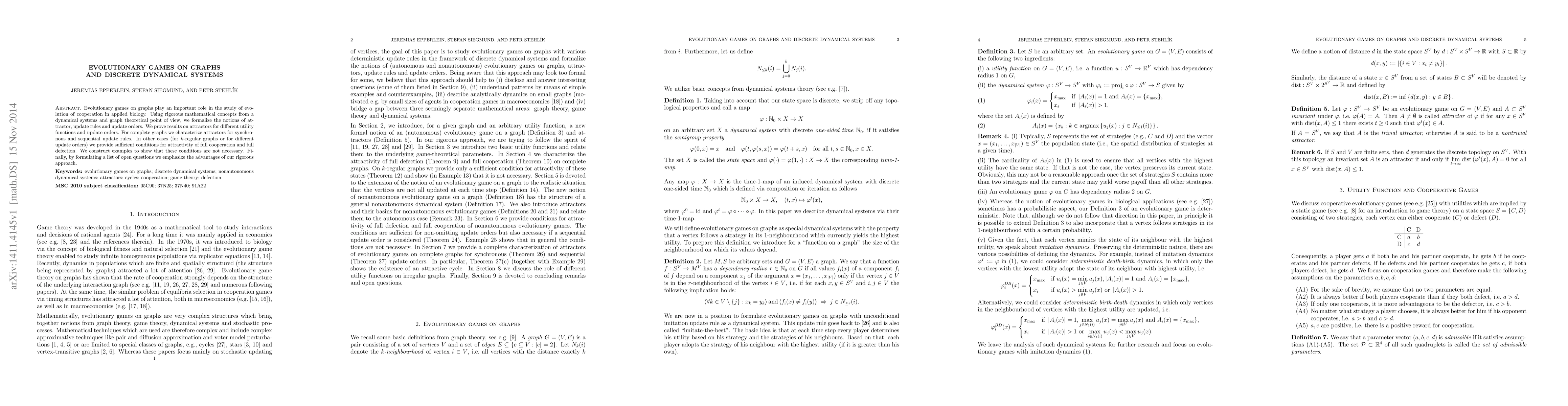 This research paper studies evolutionary games on graphs using dynamical systems and graph theory, proving results on attractors for different utility functions and update rules, and providing conditions for full cooperation or defection in various scenarios.