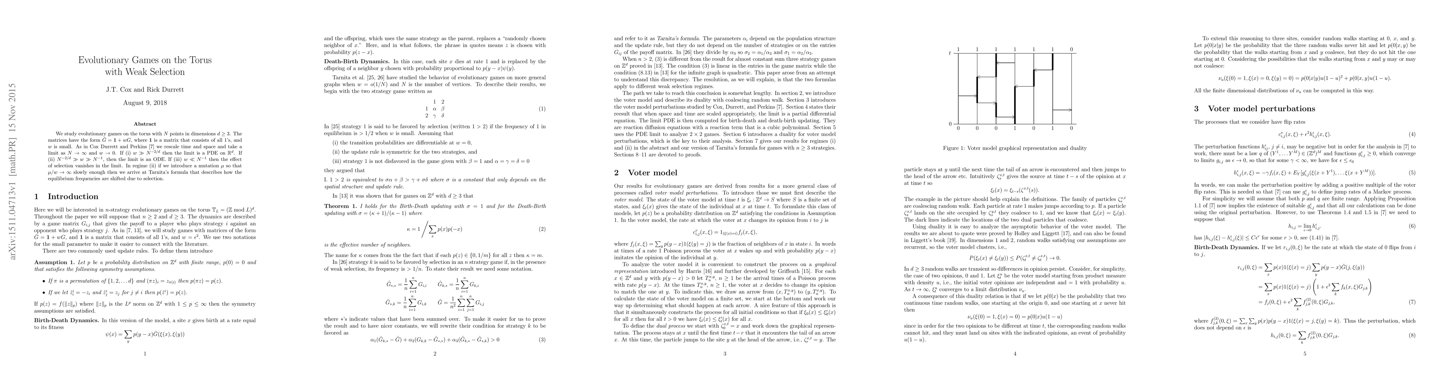 We study evolutionary games on the torus with $N$ points in dimensions $d\ge 3$. The matrices have the form $\bar G = {\bf 1} + w G$, where ${\bf 1}$ is a matrix that consists of all 1's, and $w$ is small. As in Cox Durrett and Perkins \cite{CDP} we rescale time and space and take a limit as $N\to\infty$ and $w\to 0$. If (i) $w \gg N^{-2/d}$ then the limit is a PDE on ${\bf R}^d$. If (ii) $N^{-2/d} \gg w \gg N^{-1}$, then the limit is an ODE. If (iii) $w \ll N^{-1}$ then the effect of selection vanishes in the limit. In regime (ii) if we introduce a mutation $\mu$ so that $\mu /w \to \infty$ slowly enough then we arrive at Tarnita's formula that describes how the equilibrium frequencies are shifted due to selection.