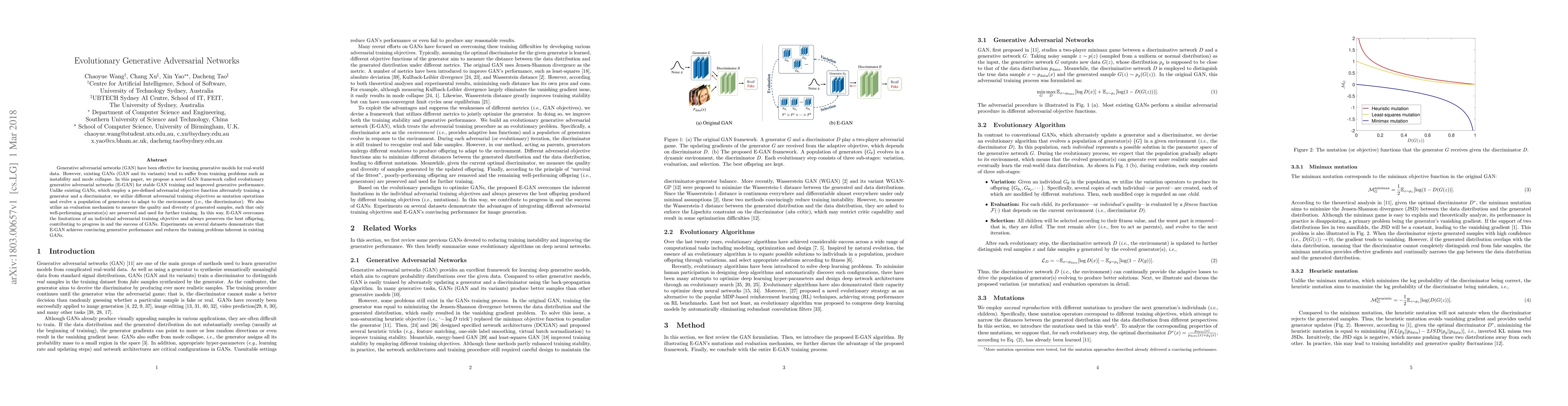 This paper introduces evolutionary generative adversarial networks (E-GAN) to address training instability and mode collapse in traditional GANs. E-GAN evolves a population of generators using mutation operations and an evaluation mechanism to preserve high-performing generators, achieving stable training and improved generative performance.