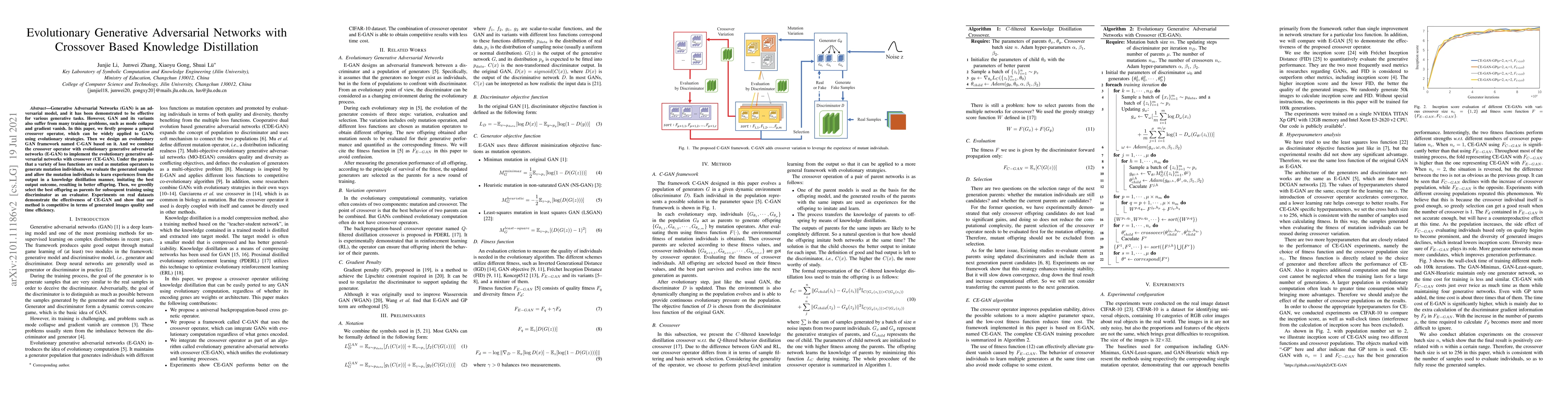 This paper proposes an evolutionary generative adversarial network (EGAN) with a crossover operator and knowledge distillation to address training issues in GANs. The CE-GAN framework combines evolutionary strategies with crossover-based knowledge distillation, leading to improved generated image quality and efficiency.