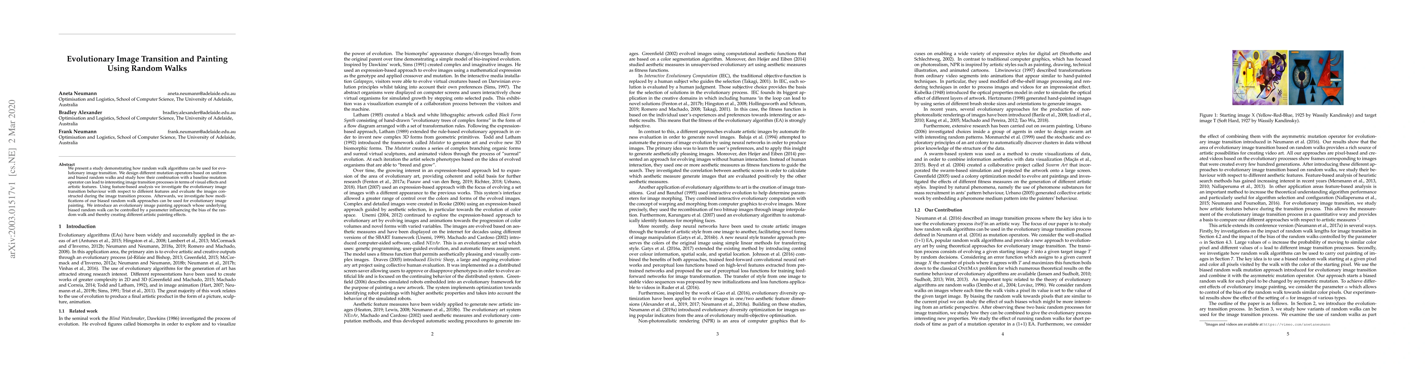 This study explores the application of random walk algorithms for evolutionary image transition and painting. It combines various mutation operators based on random walks to create visually interesting image transformations, analyzing their effects through feature-based evaluation and introducing a controlled biased random walk for artistic evolutionary painting.