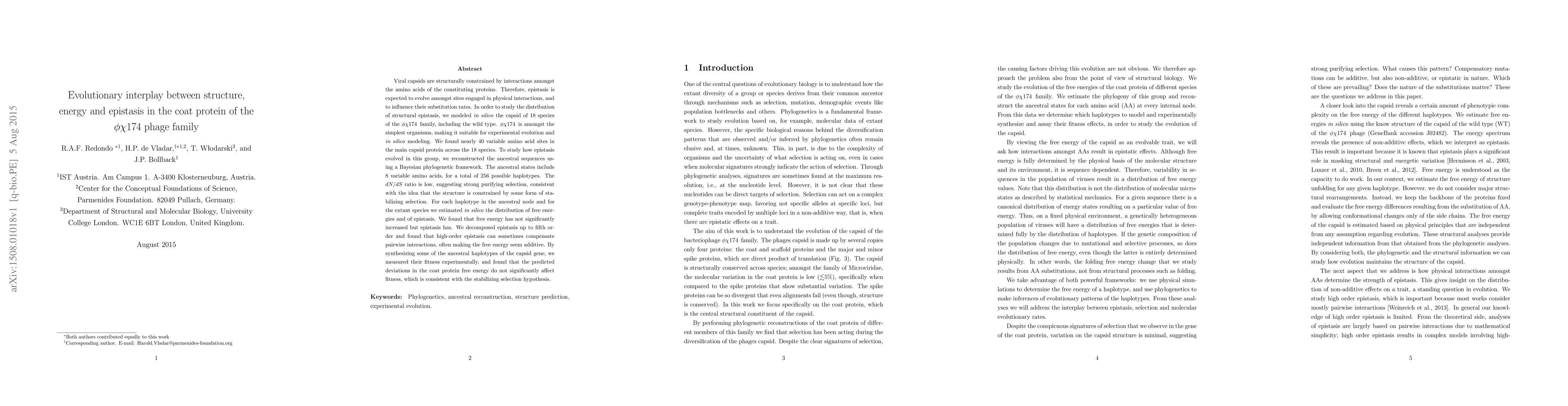 Viral capsids are structurally constrained by interactions amongst the amino acids of the constituting proteins. Therefore, epistasis is expected to evolve amongst sites engaged in physical interactions, and to influence their substitution rates. In order to study the distribution of structural epistasis, we modeled \emph{in silico} the capsid of 18 species of the \phix \, family, including the wild type. \phix \, is amongst the simplest organisms, making it suitable for experimental evolution and \emph{in silico} modeling. We found nearly 40 variable amino acid sites in the main capsid protein across the 18 species. To study how epistasis evolved in this group, we reconstructed the ancestral sequences using a Bayesian phylogenetic framework. The ancestral states include 8 variable amino acids, for a total of 256 possible haplotypes. The $dN/dS$ ratio is low, suggesting strong purifying selection, consistent with the idea that the structure is constrained by some form of stabilizing selection. For each haplotype in the ancestral node and for the extant species we estimated \emph{in silico} the distribution of free energies and of epistasis. We found that free energy has not significantly increased but epistasis has. We decomposed epistasis up to fifth order and found that high-order epistasis can sometimes compensate pairwise interactions, often making the free energy seem additive. By synthesizing some of the ancestral haplotypes of the capsid gene, we measured their fitness experimentally, and found that the predicted deviations in the coat protein free energy do not significantly affect fitness, which is consistent with the stabilizing selection hypothesis.