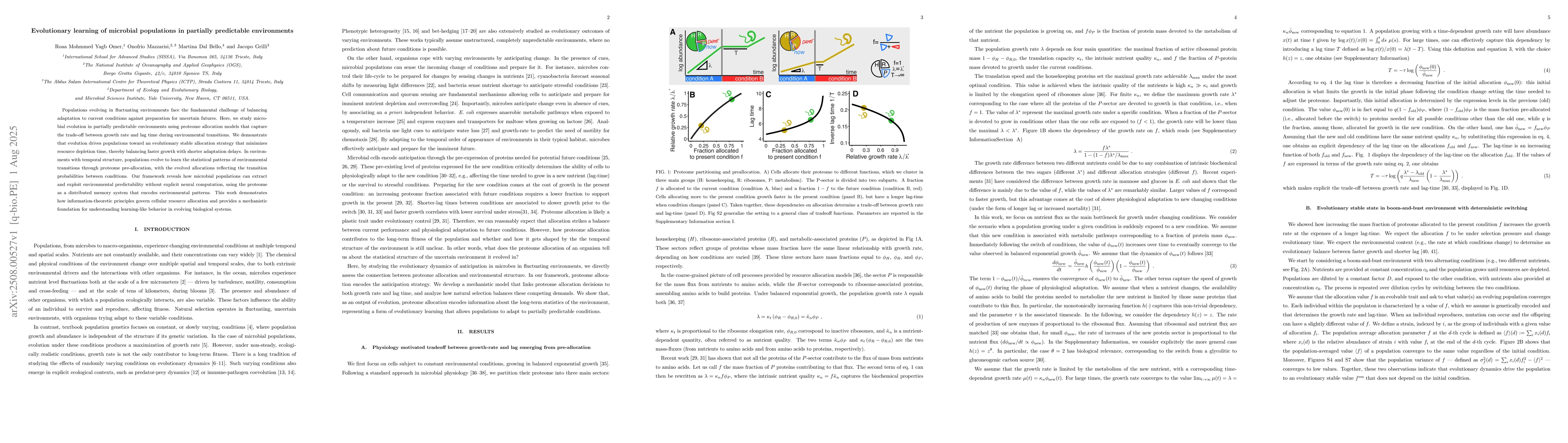 Populations evolving in fluctuating environments face the fundamental challenge of balancing adaptation to current conditions against preparation for uncertain futures. Here, we study microbial evolution in partially predictable environments using proteome allocation models that capture the trade-off between growth rate and lag time during environmental transitions. We demonstrate that evolution drives populations toward an evolutionary stable allocation strategy that minimizes resource depletion time, thereby balancing faster growth with shorter adaptation delays. In environments with temporal structure, populations evolve to learn the statistical patterns of environmental transitions through proteome pre-allocation, with the evolved allocations reflecting the transition probabilities between conditions. Our framework reveals how microbial populations can extract and exploit environmental predictability without explicit neural computation, using the proteome as a distributed memory system that encodes environmental patterns. This work demonstrates how information-theoretic principles govern cellular resource allocation and provides a mechanistic foundation for understanding learning-like behavior in evolving biological systems.