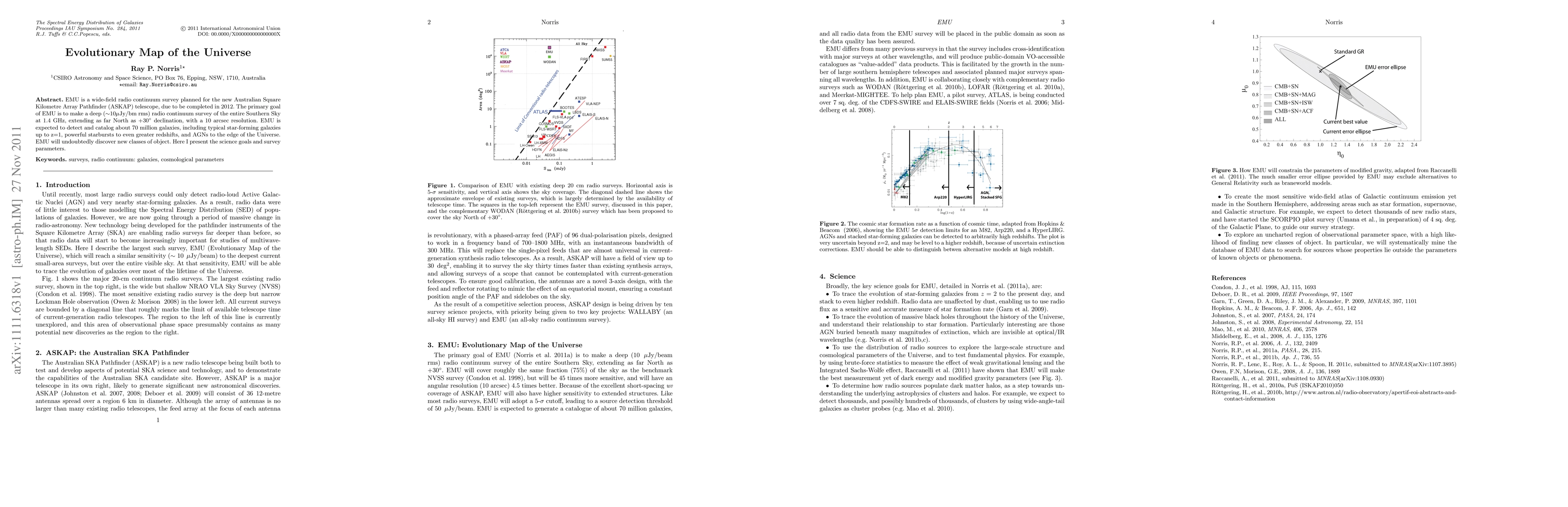 EMU will provide a deep radio continuum survey of the entire Southern Sky, enabling the study of galaxy evolution, star formation, and AGN activity over cosmic time.