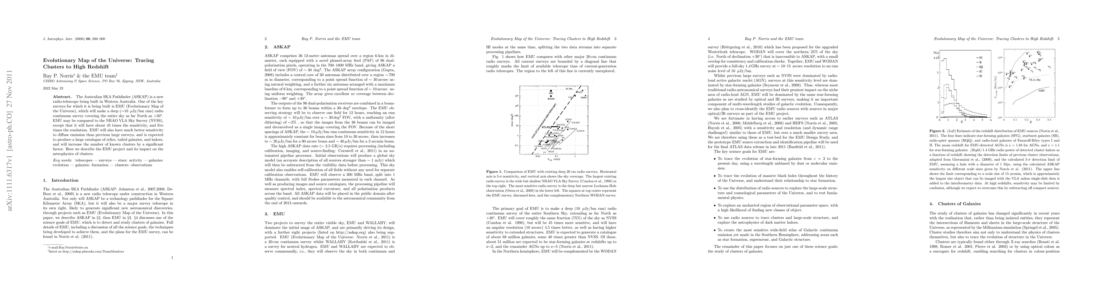 The Australian SKA Pathfinder (ASKAP) is a new radio-telescope being built in Western Australia. One of the key surveys for which it is being built is EMU (Evolutionary Map of the Universe), which will make a deep (~10 {\mu}Jy/bm rms) radio continuum survey covering the entire sky as far North as +30\circ. EMU may be compared to the NRAO VLA Sky Survey (NVSS), except that it will have about 45 times the sensitivity, and five times the resolution. EMU will also have much better sensitivity to diffuse emission than previous large surveys, and is expected to produce a large catalogue of relics, tailed galaxies, and haloes, and will increase the number of known clusters by a significant factor. Here we describe the EMU project and its impact on the astrophysics of clusters.