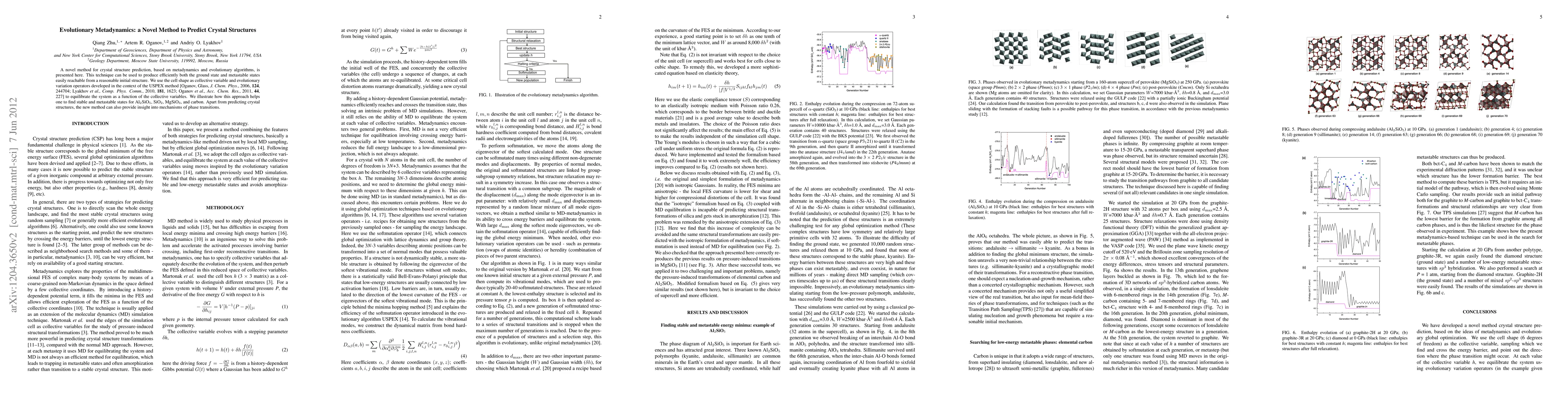 A novel method for crystal structure prediction, based on metadynamics and evolutionary algorithms, is presented here. This technique can be used to produce efficiently both the ground state and metastable states easily reachable from a reasonable initial structure. We use the cell shape as collective variable and evolutionary variation operators developed in the context of the USPEX method [Oganov, Glass, \textit{J. Chem. Phys.}, 2006, \textbf{124}, 244704; Lyakhov \textit{et al., Comp. Phys. Comm.}, 2010, \textbf{181}, 1623; Oganov \textit{et al., Acc. Chem. Res.}, 2011, \textbf{44}, 227] to equilibrate the system as a function of the collective variables. We illustrate how this approach helps one to find stable and metastable states for Al$_2$SiO$_5$, SiO$_2$, MgSiO$_3$, and carbon. Apart from predicting crystal structures, the new method can also provide insight into mechanisms of phase transitions.