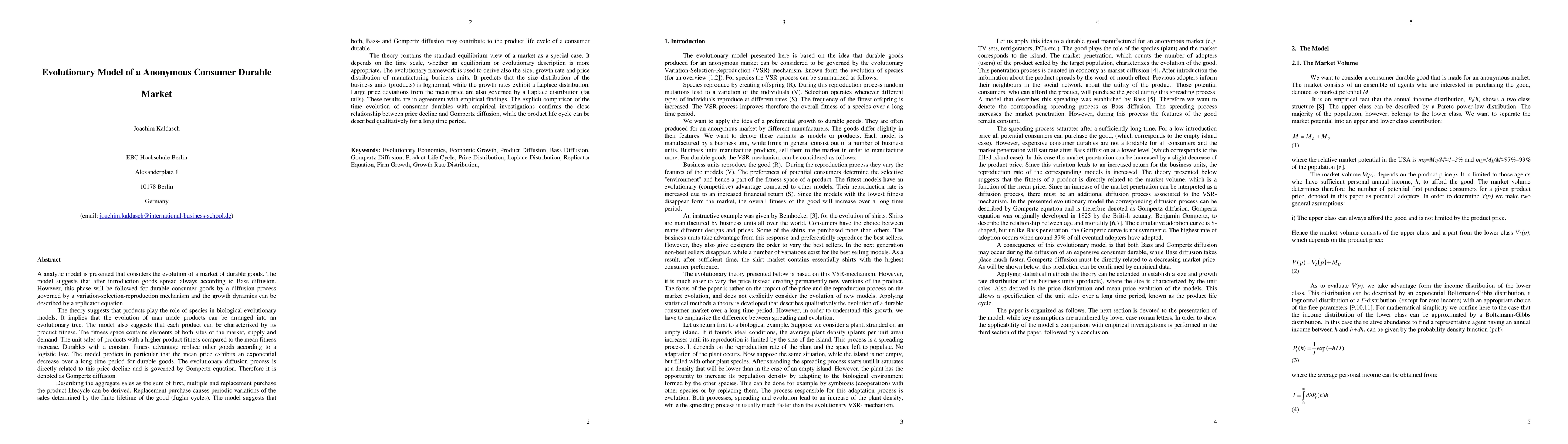 This paper presents a model that describes the evolution of consumer durable markets using Bass diffusion and variation-selection-reproduction mechanisms, predicting lognormal product size distribution, Laplace growth rates, and fat-tailed price distributions.