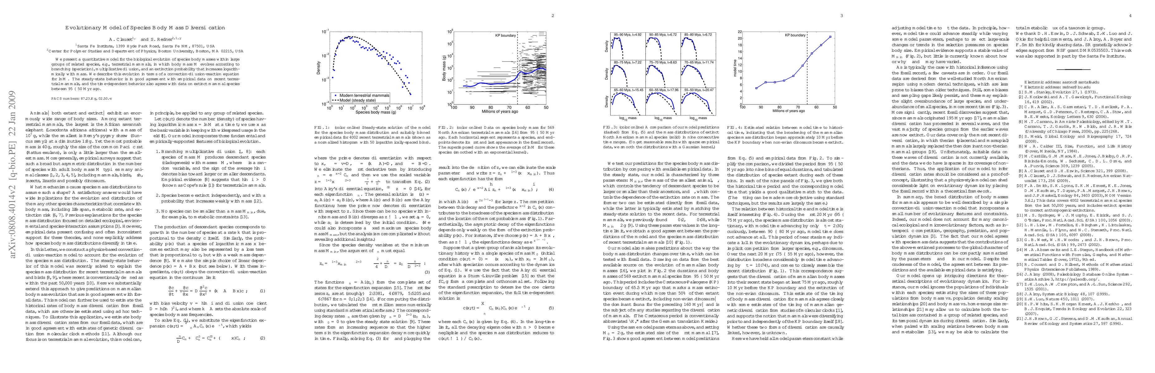 The research presents a physics-based convection-diffusion-reaction model to account for the evolution of species mass distribution, incorporating branching (speciation), multiplicative diffusion, and extinction probability that increases logarithmically with mass. The model uses a continuum limit equation and eigenfunction expansion to describe the evolution of species body mass distribution.