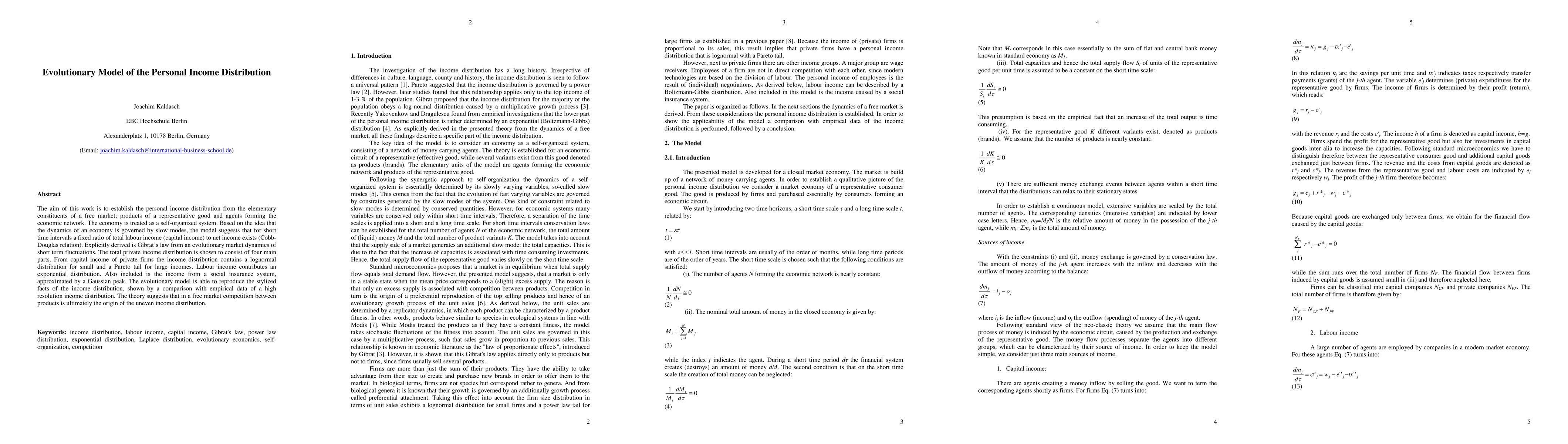 This research presents an evolutionary model of personal income distribution, viewing the economy as a self-organized system. It identifies four main components of income distribution: capital income with lognormal and Pareto tails, labor income with exponential distribution, and social insurance income approximated by a Gaussian peak. The model successfully replicates empirical income distribution data, suggesting competition in free markets drives income inequality.