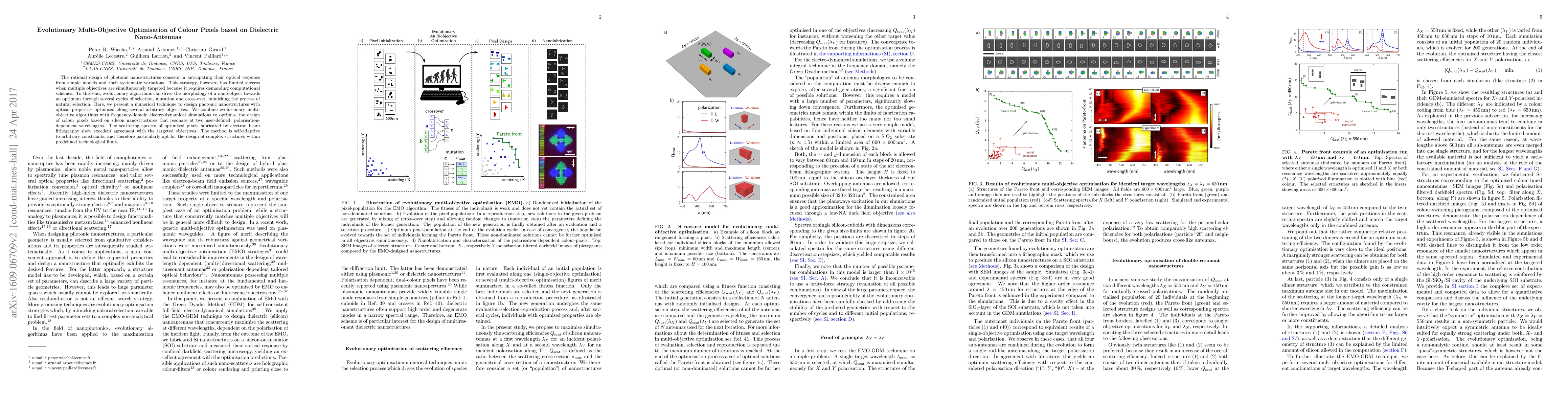 Researchers developed a method to design photonic nanostructures with optimized optical properties for multiple objectives using evolutionary multi-objective algorithms and frequency-domain simulations. The approach shows excellent agreement with targeted objectives in fabricated pixels.