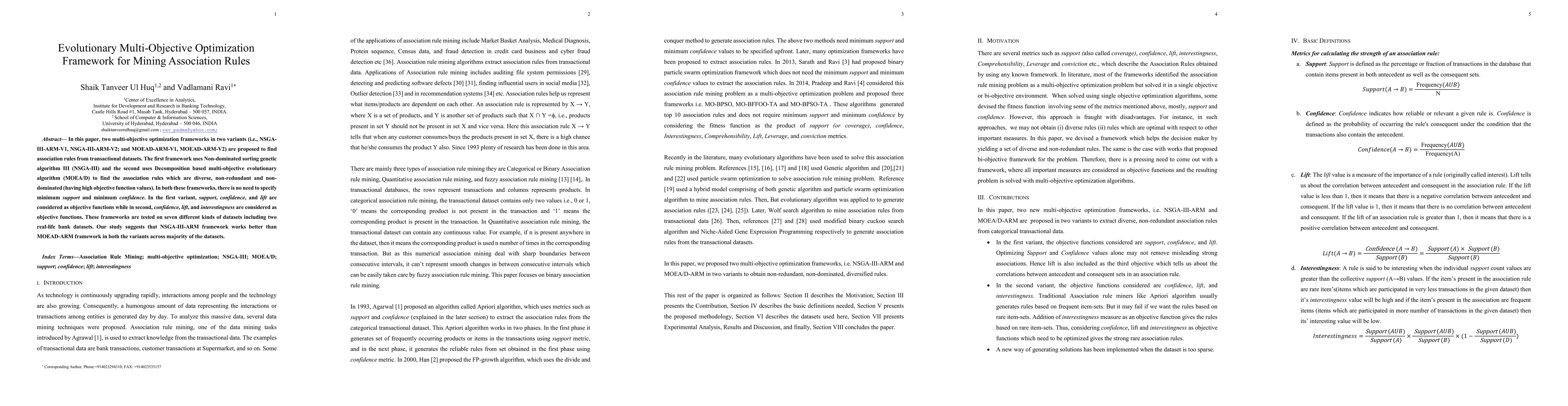 This paper proposes two multi-objective optimization frameworks (NSGA-III-ARM and MOEAD-ARM) to discover diverse, non-redundant association rules from transactional datasets without predefined support and confidence thresholds. NSGA-III-ARM outperforms MOEAD-ARM across most tested datasets.