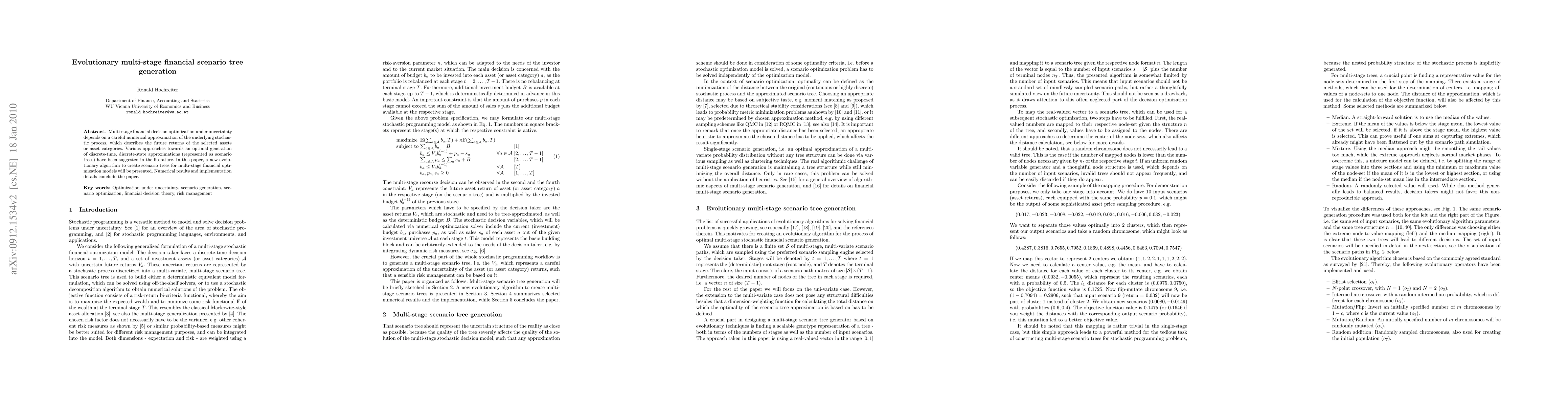 Multi-stage financial decision optimization under uncertainty depends on a careful numerical approximation of the underlying stochastic process, which describes the future returns of the selected assets or asset categories. Various approaches towards an optimal generation of discrete-time, discrete-state approximations (represented as scenario trees) have been suggested in the literature. In this paper, a new evolutionary algorithm to create scenario trees for multi-stage financial optimization models will be presented. Numerical results and implementation details conclude the paper.