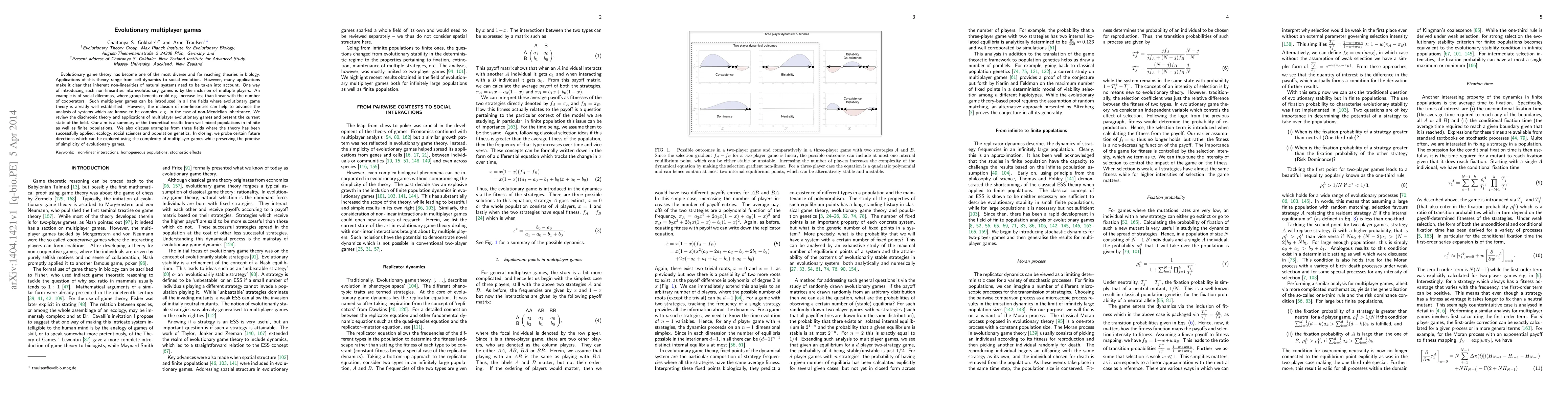 Evolutionary game theory has become one of the most diverse and far reaching theories in biology. Applications of this theory range from cell dynamics to social evolution. However, many applications make it clear that inherent non-linearities of natural systems need to be taken into account. One way of introducing such non-linearities into evolutionary games is by the inclusion of multiple players. An example is of social dilemmas, where group benefits could e.g.\ increase less than linear with the number of cooperators. Such multiplayer games can be introduced in all the fields where evolutionary game theory is already well established. However, the inclusion of non-linearities can help to advance the analysis of systems which are known to be complex, e.g. in the case of non-Mendelian inheritance. We review the diachronic theory and applications of multiplayer evolutionary games and present the current state of the field. Our aim is a summary of the theoretical results from well-mixed populations in infinite as well as finite populations. We also discuss examples from three fields where the theory has been successfully applied, ecology, social sciences and population genetics. In closing, we probe certain future directions which can be explored using the complexity of multiplayer games while preserving the promise of simplicity of evolutionary games.
