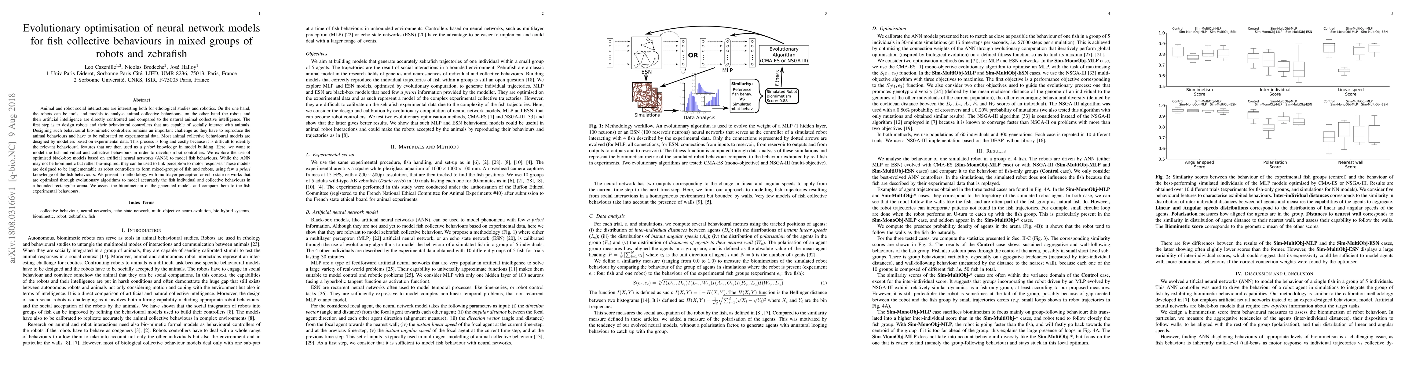 Animal and robot social interactions are interesting both for ethological studies and robotics. On the one hand, the robots can be tools and models to analyse animal collective behaviours, on the other hand, the robots and their artificial intelligence are directly confronted and compared to the natural animal collective intelligence. The first step is to design robots and their behavioural controllers that are capable of socially interact with animals. Designing such behavioural bio-mimetic controllers remains an important challenge as they have to reproduce the animal behaviours and have to be calibrated on experimental data. Most animal collective behavioural models are designed by modellers based on experimental data. This process is long and costly because it is difficult to identify the relevant behavioural features that are then used as a priori knowledge in model building. Here, we want to model the fish individual and collective behaviours in order to develop robot controllers. We explore the use of optimised black-box models based on artificial neural networks (ANN) to model fish behaviours. While the ANN may not be biomimetic but rather bio-inspired, they can be used to link perception to motor responses. These models are designed to be implementable as robot controllers to form mixed-groups of fish and robots, using few a priori knowledge of the fish behaviours. We present a methodology with multilayer perceptron or echo state networks that are optimised through evolutionary algorithms to model accurately the fish individual and collective behaviours in a bounded rectangular arena. We assess the biomimetism of the generated models and compare them to the fish experimental behaviours.