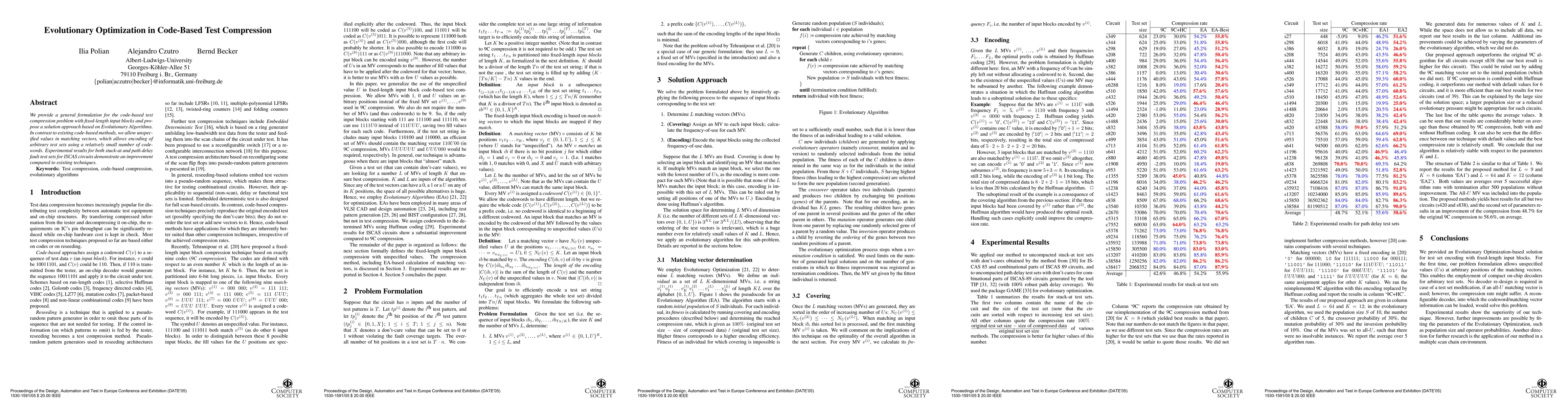 The paper presents an Evolutionary Optimization-based solution for test set encoding with fixed-length input blocks, introducing unspecified values in matching vectors for the first time.