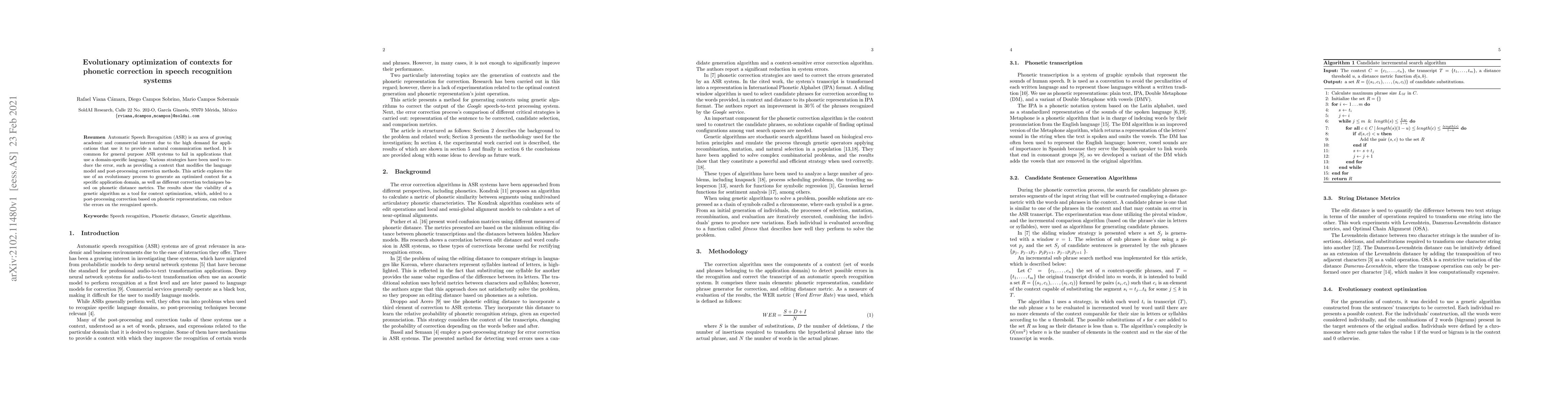 Automatic Speech Recognition (ASR) is an area of growing academic and commercial interest due to the high demand for applications that use it to provide a natural communication method. It is common for general purpose ASR systems to fail in applications that use a domain-specific language. Various strategies have been used to reduce the error, such as providing a context that modifies the language model and post-processing correction methods. This article explores the use of an evolutionary process to generate an optimized context for a specific application domain, as well as different correction techniques based on phonetic distance metrics. The results show the viability of a genetic algorithm as a tool for context optimization, which, added to a post-processing correction based on phonetic representations, can reduce the errors on the recognized speech.