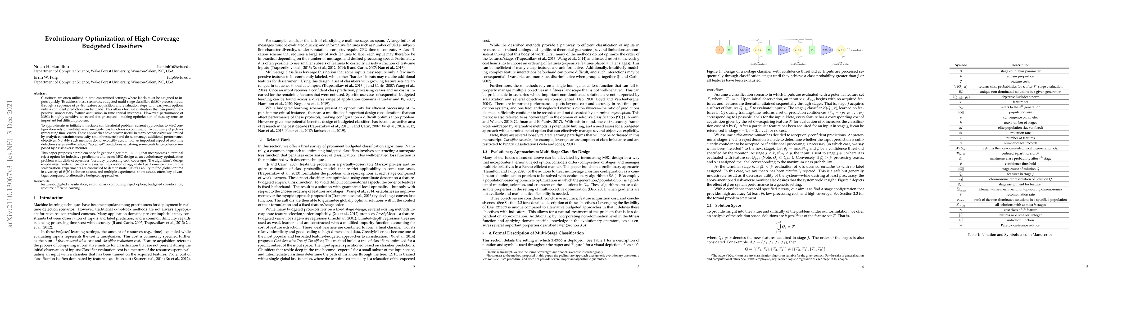 This paper introduces a genetic algorithm called EMSCO to optimize budgeted multi-stage classifiers for fast evaluation in time-constrained settings. EMSCO aims to find the optimal balance between accuracy, cost, and coverage while considering a terminal reject option for indecisive predictions.