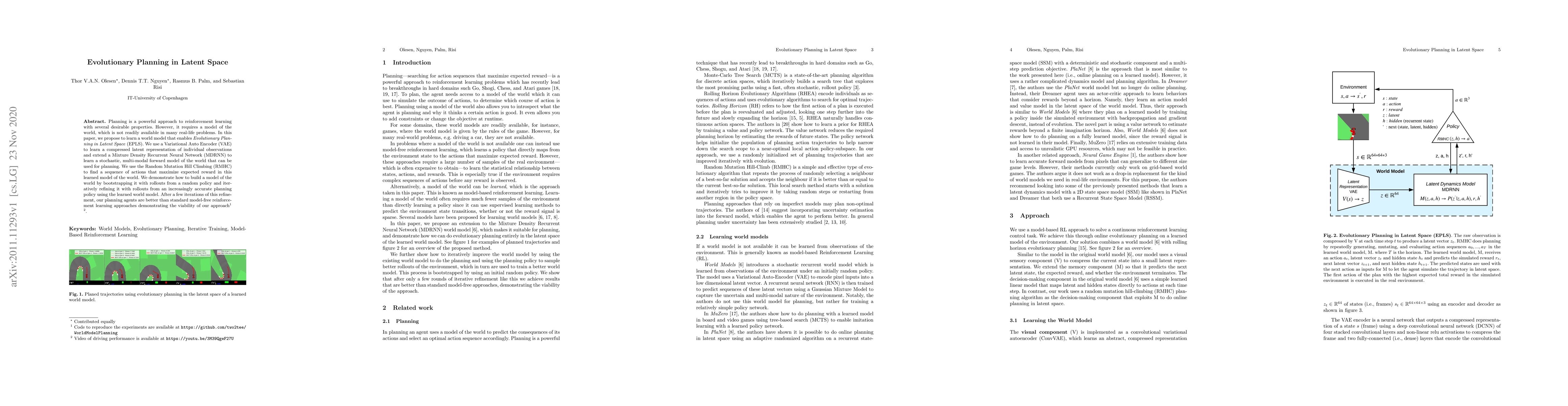 Planning is a powerful approach to reinforcement learning with several desirable properties. However, it requires a model of the world, which is not readily available in many real-life problems. In this paper, we propose to learn a world model that enables Evolutionary Planning in Latent Space (EPLS). We use a Variational Auto Encoder (VAE) to learn a compressed latent representation of individual observations and extend a Mixture Density Recurrent Neural Network (MDRNN) to learn a stochastic, multi-modal forward model of the world that can be used for planning. We use the Random Mutation Hill Climbing (RMHC) to find a sequence of actions that maximize expected reward in this learned model of the world. We demonstrate how to build a model of the world by bootstrapping it with rollouts from a random policy and iteratively refining it with rollouts from an increasingly accurate planning policy using the learned world model. After a few iterations of this refinement, our planning agents are better than standard model-free reinforcement learning approaches demonstrating the viability of our approach.