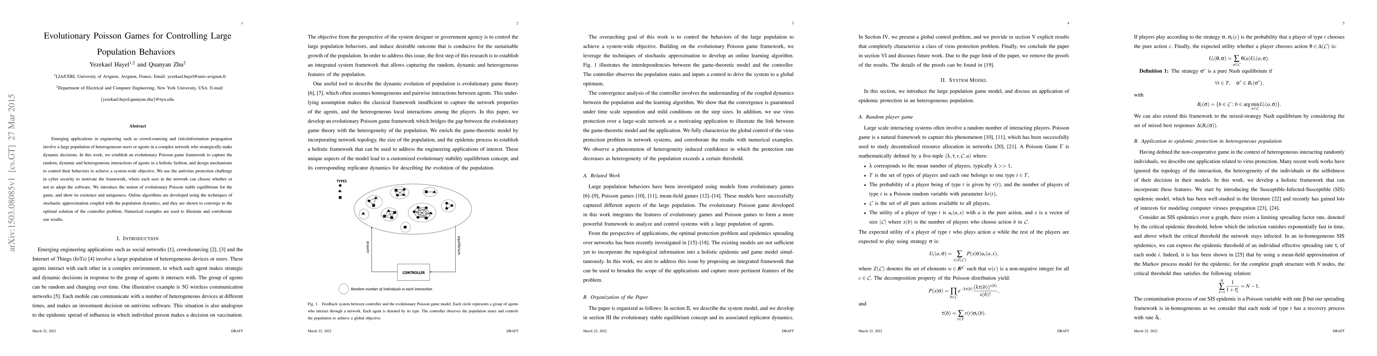 Emerging applications in engineering such as crowd-sourcing and (mis)information propagation involve a large population of heterogeneous users or agents in a complex network who strategically make dynamic decisions. In this work, we establish an evolutionary Poisson game framework to capture the random, dynamic and heterogeneous interactions of agents in a holistic fashion, and design mechanisms to control their behaviors to achieve a system-wide objective. We use the antivirus protection challenge in cyber security to motivate the framework, where each user in the network can choose whether or not to adopt the software. We introduce the notion of evolutionary Poisson stable equilibrium for the game, and show its existence and uniqueness. Online algorithms are developed using the techniques of stochastic approximation coupled with the population dynamics, and they are shown to converge to the optimal solution of the controller problem. Numerical examples are used to illustrate and corroborate our results.