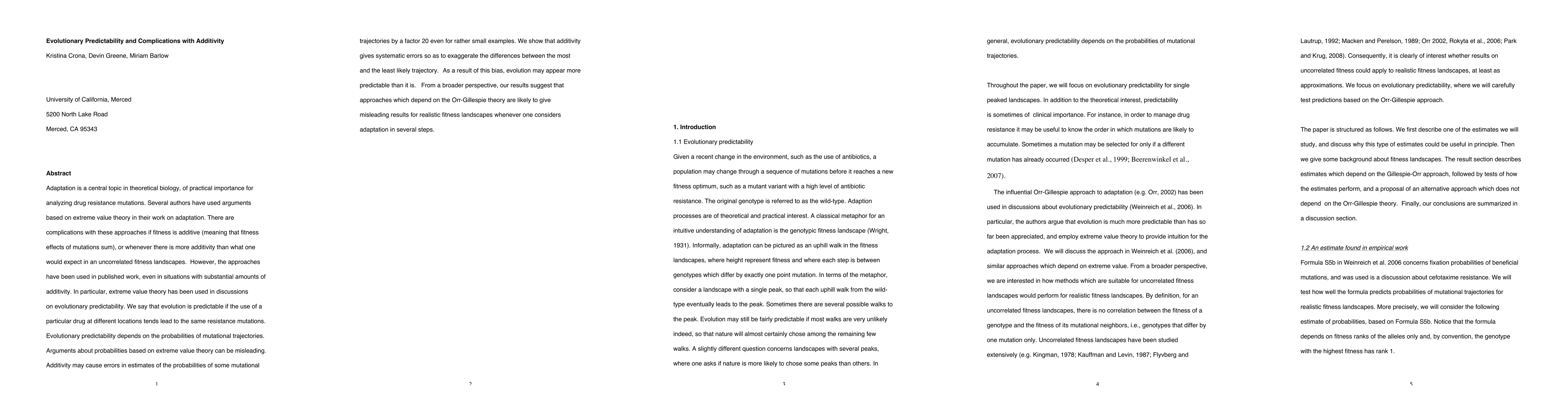 Adaptation is a central topic in theoretical biology, of practical importance for analyzing drug resistance mutations. Several authors have used arguments based on extreme value theory in their work on adaptation. There are complications with these approaches if fitness is additive (meaning that fitness effects of mutations sum), or whenever there is more additivity than what one would expect in an uncorrelated fitness landscape. However, the approaches have been used in published work, even in situations with substantial amounts of additivity. In particular, extreme value theory has been used in discussions on evolutionary predictability. We say that evolution is predictable if the use of a particular drug at different locations tends lead to the same resistance mutations. Evolutionary predictability depends on the probabilities of mutational trajectories. Arguments about probabilities based on extreme value theory can be misleading. Additivity may cause errors in estimates of the probabilities of some mutational trajectories by a factor 20 even for rather small examples. We show that additivity gives systematic errors so as to exaggerate the differences between the most and the least likely trajectory. As a result of this bias, evolution may appear more predictable than it is. From a broader perspective, our results suggest that approaches which depend on the Orr-Gillespie theory are likely to give misleading results for realistic fitness landscapes whenever one considers adaptation in several steps.