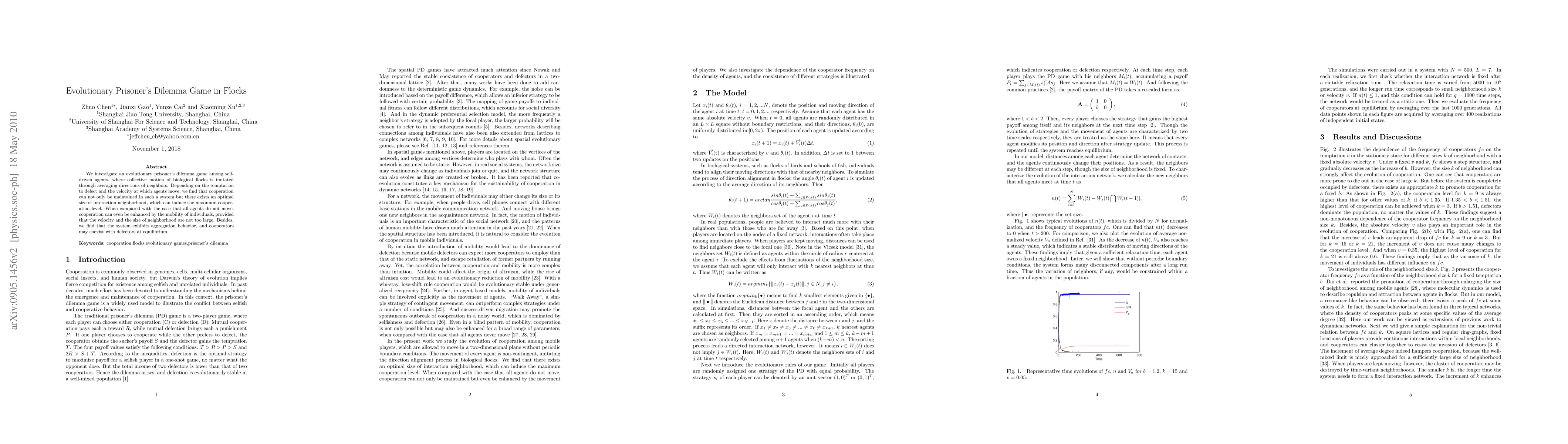 This study explores an evolutionary prisoner's dilemma among self-driven agents mimicking flock behavior, revealing that optimal interaction neighborhood sizes can maximize cooperation, and mobility can enhance cooperation if not excessive. The system also shows aggregation behavior, allowing cooperators and defectors to coexist at equilibrium.