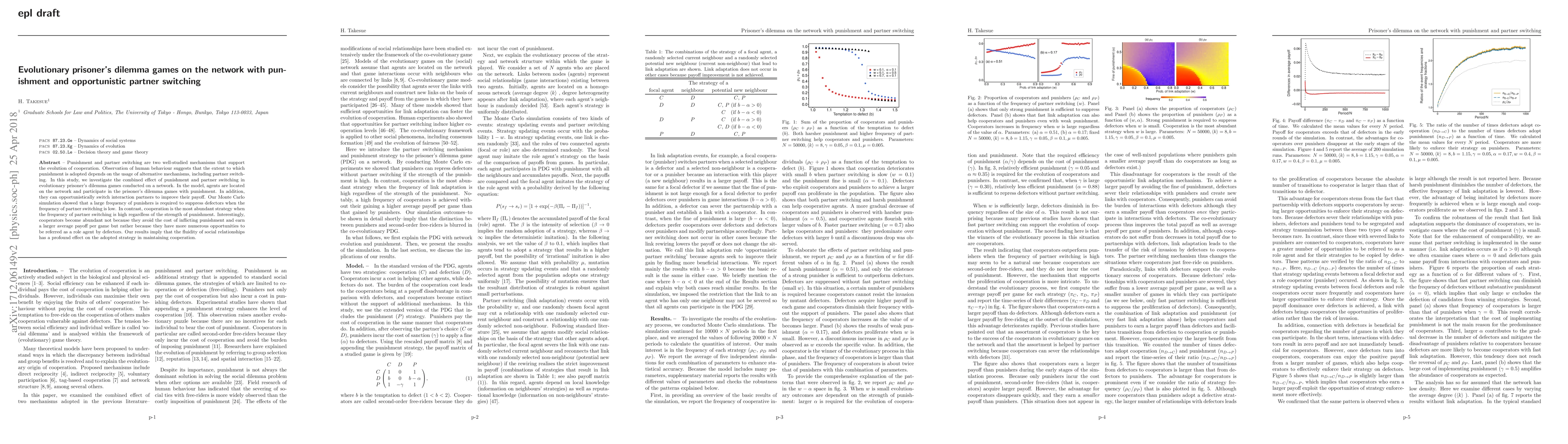 This study explores how punishment and partner switching influence cooperation in evolutionary prisoner's dilemma games on a network. Simulation results show that cooperation thrives with high partner switching frequency, regardless of punishment strength, suggesting social fluidity significantly impacts cooperative strategies.