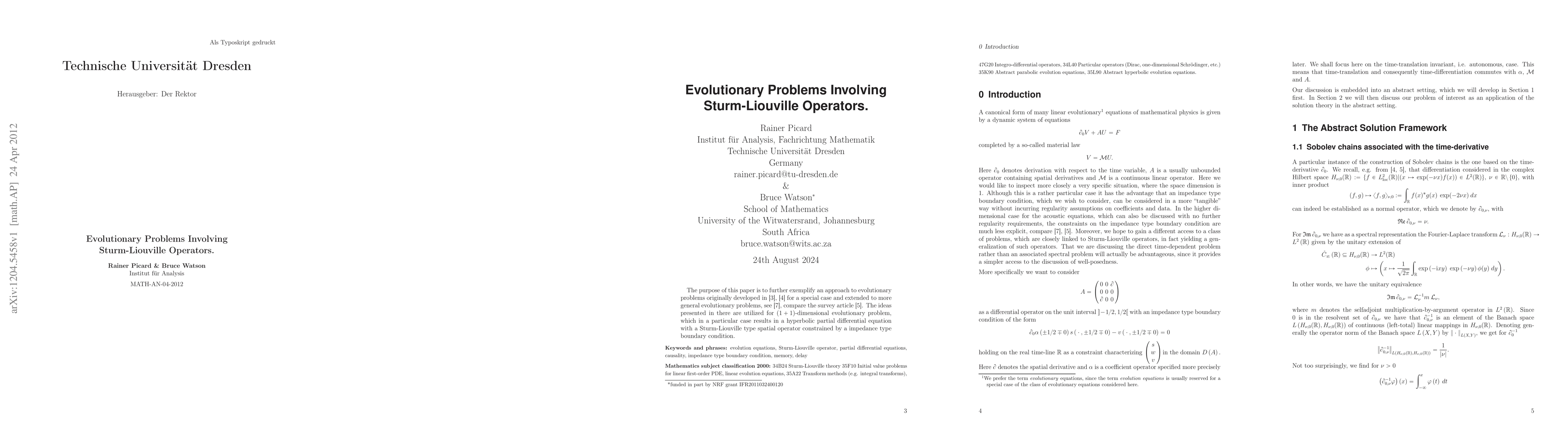 The purpose of this paper is to further exemplify an approach to evolutionary problems originally developed in earlier works for a special case and later extended to more general evolutionary problems. We are here concerned with the $(1+1)$ -dimensional evolutionary case, which in a particular case results in a hyperbolic partial differential equation with a Sturm-Liouville type spatial operator constrained by an impedance type boundary condition.