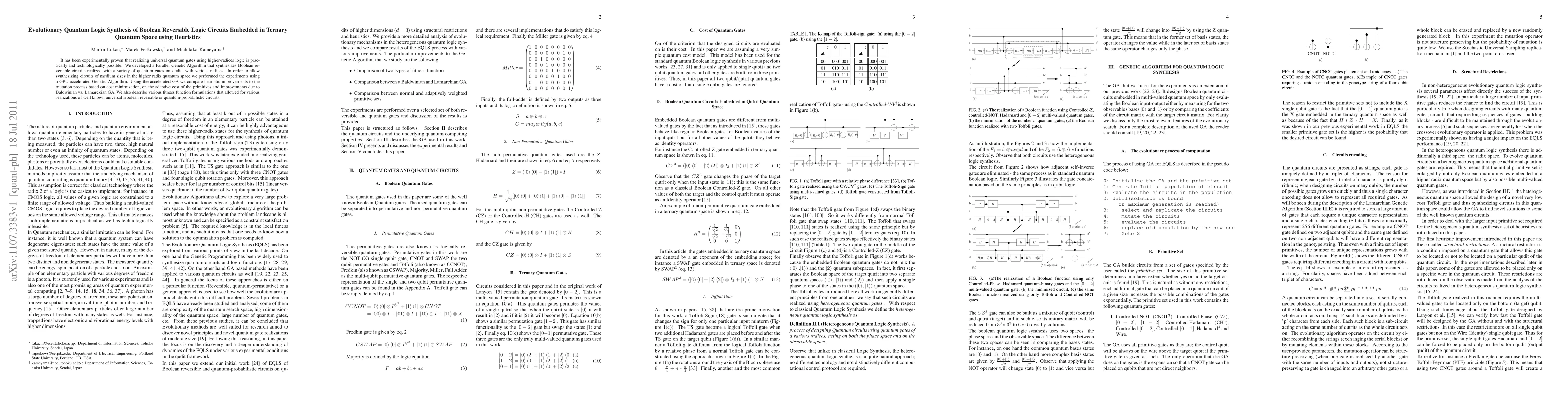 The paper introduces a GPU-accelerated Parallel Genetic Algorithm for synthesizing Boolean reversible circuits using various quantum gates on qudits with different radices, incorporating heuristic improvements to the mutation process and comparing Baldwinian vs. Lamarckian GA.