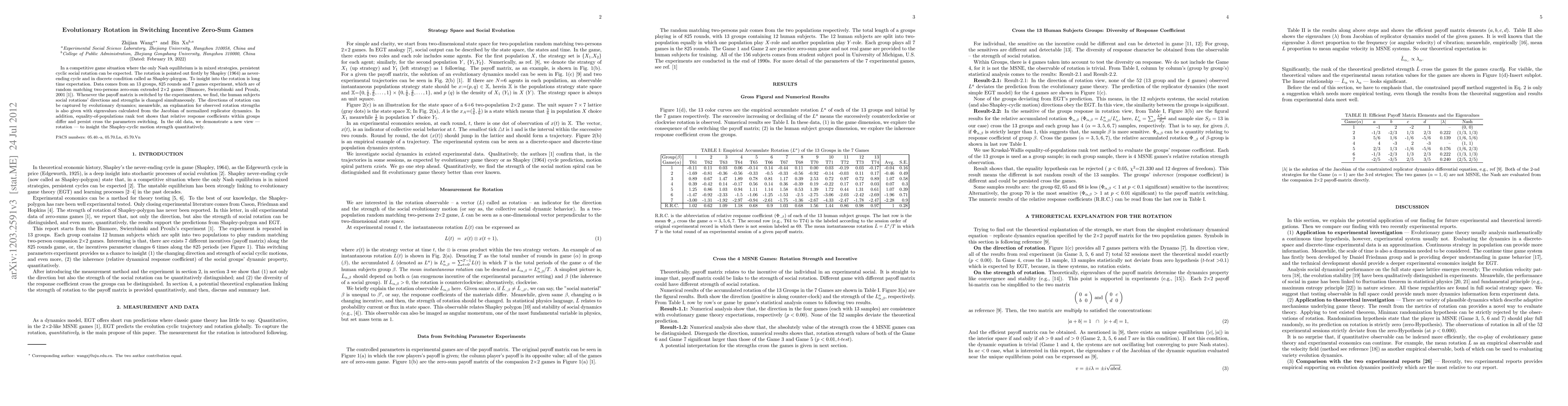 This paper investigates the evolutionary rotation in switching incentive zero-sum games through laboratory experiments, finding that changes in incentive parameters lead to shifts in population strategy and rotation dynamics. The study uses a constrained replicator dynamics model to quantify these shifts and supports Von Neumann's minimax theory.