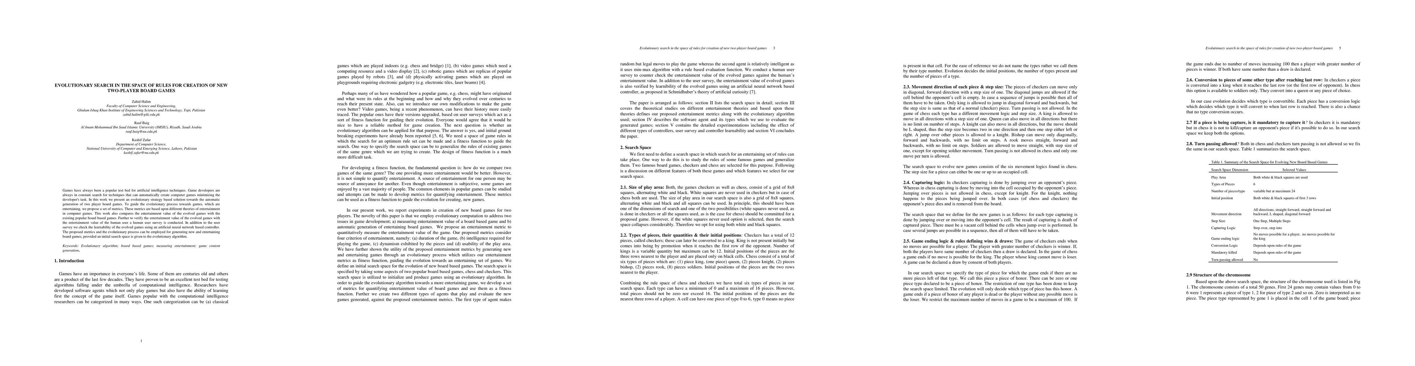 Games have always been a popular test bed for artificial intelligence techniques. Game developers are always in constant search for techniques that can automatically create computer games minimizing the developer's task. In this work we present an evolutionary strategy based solution towards the automatic generation of two player board games. To guide the evolutionary process towards games, which are entertaining, we propose a set of metrics. These metrics are based upon different theories of entertainment in computer games. This work also compares the entertainment value of the evolved games with the existing popular board based games. Further to verify the entertainment value of the evolved games with the entertainment value of the human user a human user survey is conducted. In addition to the user survey we check the learnability of the evolved games using an artificial neural network based controller. The proposed metrics and the evolutionary process can be employed for generating new and entertaining board games, provided an initial search space is given to the evolutionary algorithm.