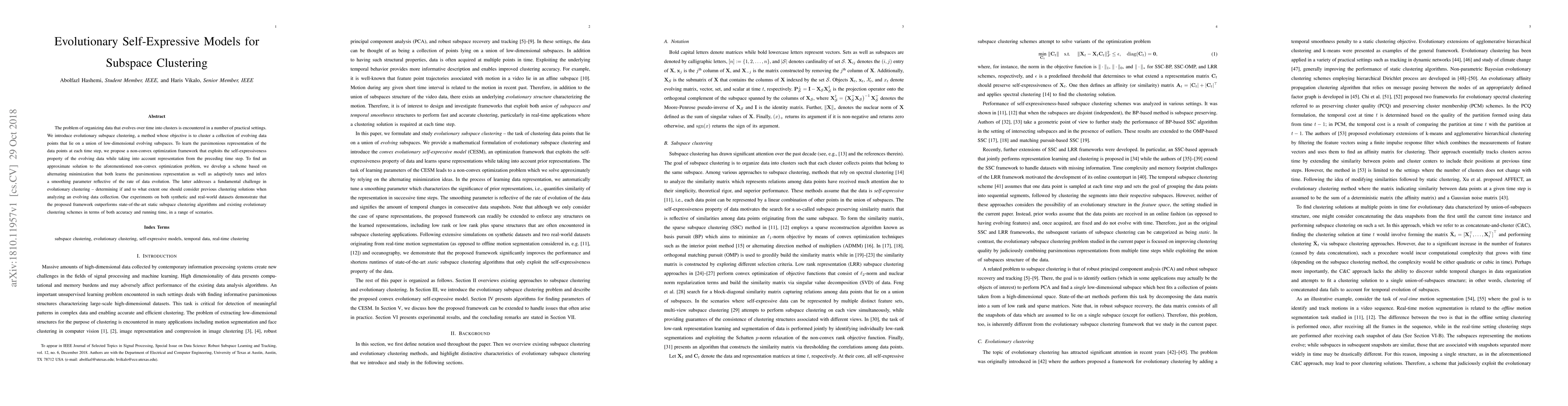 A new method called evolutionary subspace clustering is proposed to organize data that evolves over time into clusters, outperforming existing algorithms in accuracy and running time.