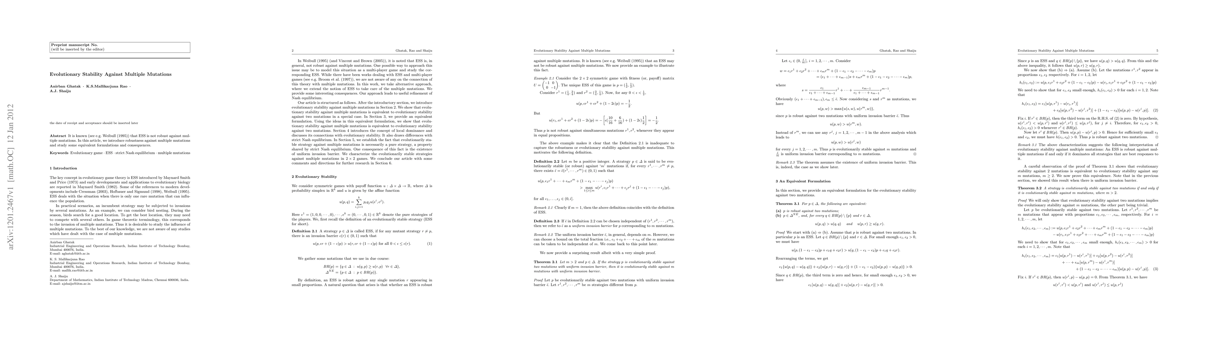 This paper introduces the concept of robustness against multiple mutations, addressing the known vulnerability of Evolutionary Stable Strategies (ESS) to such mutations. It explores equivalent formulations and consequences of this robustness.