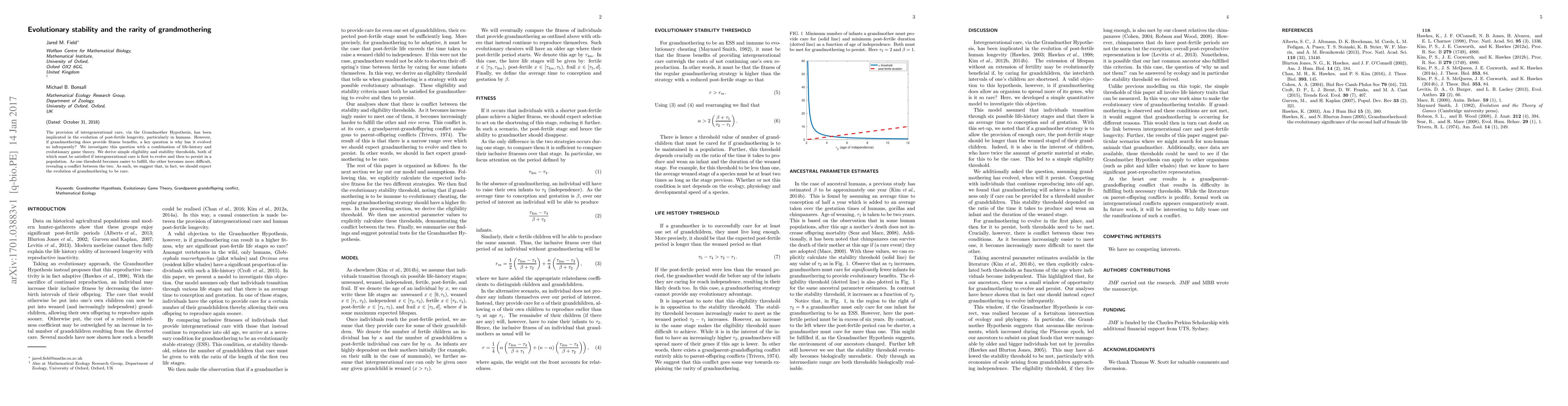 This paper explores the evolutionary stability of grandmothering, suggesting that its rarity can be explained by conflicting eligibility and stability thresholds in life-history and evolutionary game theory. The study concludes that the evolution of post-fertile longevity for intergenerational care should be expected to be infrequent.