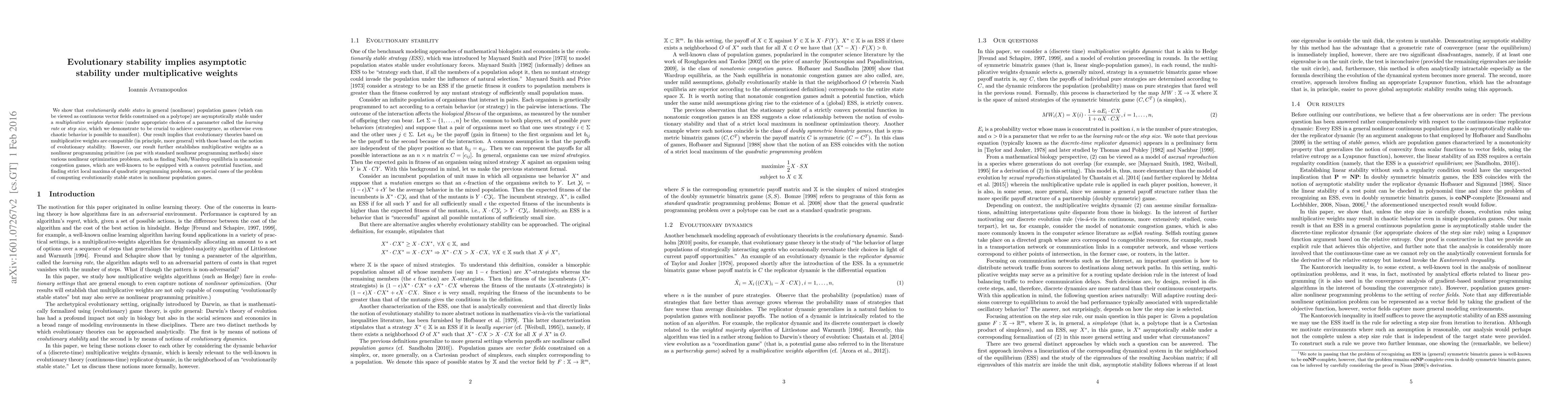 We show that evolutionarily stable states in general (nonlinear) population games (which can be viewed as continuous vector fields constrained on a polytope) are asymptotically stable under a multiplicative weights dynamic (under appropriate choices of a parameter called the learning rate or step size, which we demonstrate to be crucial to achieve convergence, as otherwise even chaotic behavior is possible to manifest). Our result implies that evolutionary theories based on multiplicative weights are compatible (in principle, more general) with those based on the notion of evolutionary stability. However, our result further establishes multiplicative weights as a nonlinear programming primitive (on par with standard nonlinear programming methods) since various nonlinear optimization problems, such as finding Nash/Wardrop equilibria in nonatomic congestion games, which are well-known to be equipped with a convex potential function, and finding strict local maxima of quadratic programming problems, are special cases of the problem of computing evolutionarily stable states in nonlinear population games.