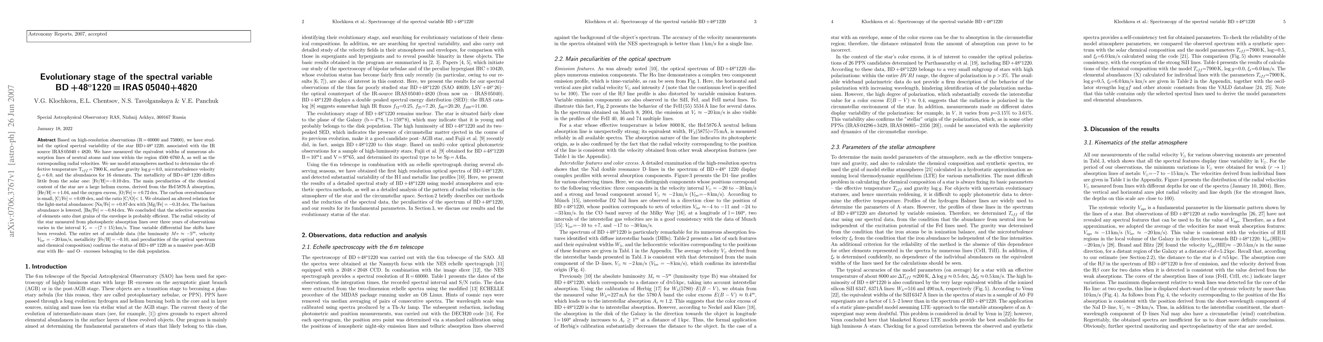 Based on high-resolution observations (R=60000 and 75000), we have studied the optical spectral variability of the star BD+48 1220 (IRAS05040+4820). We have measured the equivalent widths of numerous absorption lines of neutral atoms and ions at wavelengths from 4500 to 6760 AA, as well as the corresponding radial velocities. We use model atmospheres to determine Teff=7900K, log g=0.0, microturbulence velocity xi_t=6.0, and the abundances for 16 elements. The star's metallicity differs little from the solar value: [Fe/H]=-0.10 dex. The main peculiarity of the chemical composition of the star is a large He-excess, derived from the HeI 5876 A absorption, [He/H]=+1.04, and the equally large O-excess, [O/Fe]=+0.72 dex. The C-excess is small, [C/Fe]=+0.09 dex, and the ratio [C/O]$\le$ 1. We obtained a revised relation for the light-metal abundances: [Na/Fe]=+0.87 with [Mg/Fe]=-0.31. The barium abundance is low, [Ba/Fe]=-0.84. The radial velocity of the star measured from photospheric absorption lines over three years of observations varies in the interval V_sun = -(7 - 15) km/s. Time variable differential line shifts have been revealed. The entire set of available data (the luminosity Mv~-5m, velocity V_lsr~-20 km/s, metallicity [Fe/H]=-0.10, and peculiarities of the optical spectrum and chemical composition) confirms the status of BD+48 1220 as a post-AGB star with He- and O-excesses belonging to the Galactic disk.