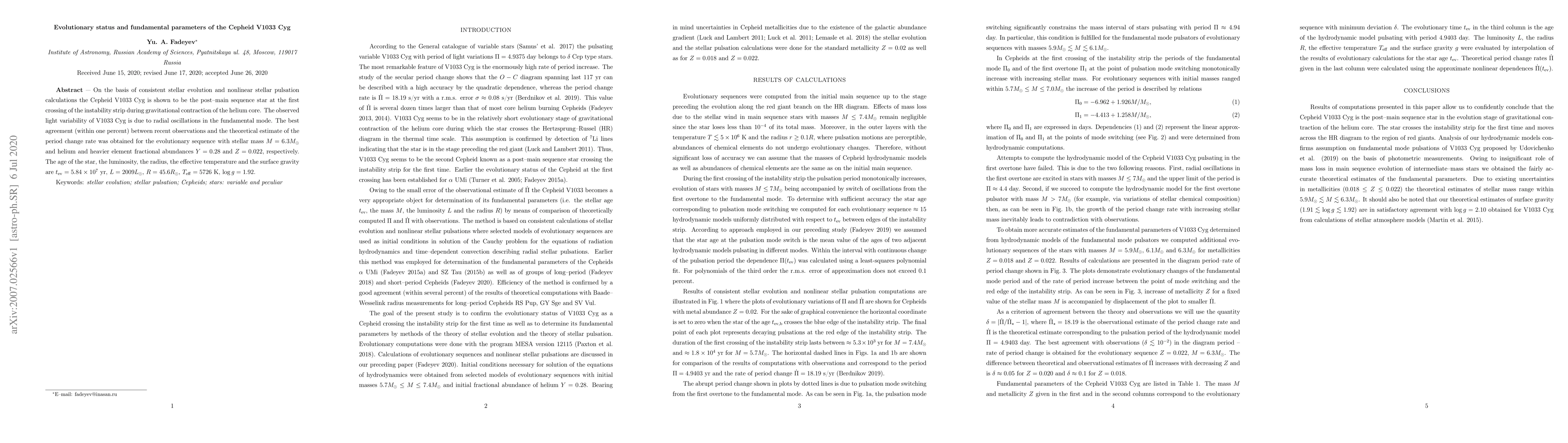 The Cepheid V1033 Cyg is a post-main sequence star that underwent gravitational contraction of its helium core, causing radial oscillations in the fundamental mode, which were accurately predicted by stellar evolution calculations.