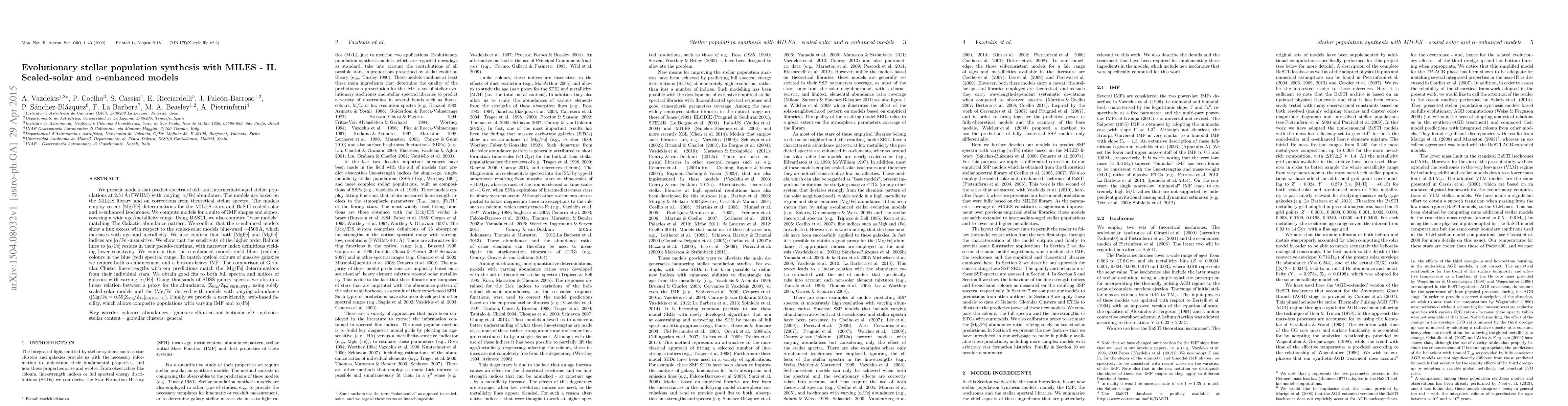 This paper presents evolutionary stellar population synthesis models based on the MILES library, predicting spectra for old- and intermediate-aged populations with varying [\alpha/Fe] abundance. The models show that \alpha-enhanced models exhibit a flux excess compared to scaled-solar models, especially in the blue spectral range, and require both \alpha-enhancement and a bottom-heavy IMF to match the optical colors of massive galaxies.