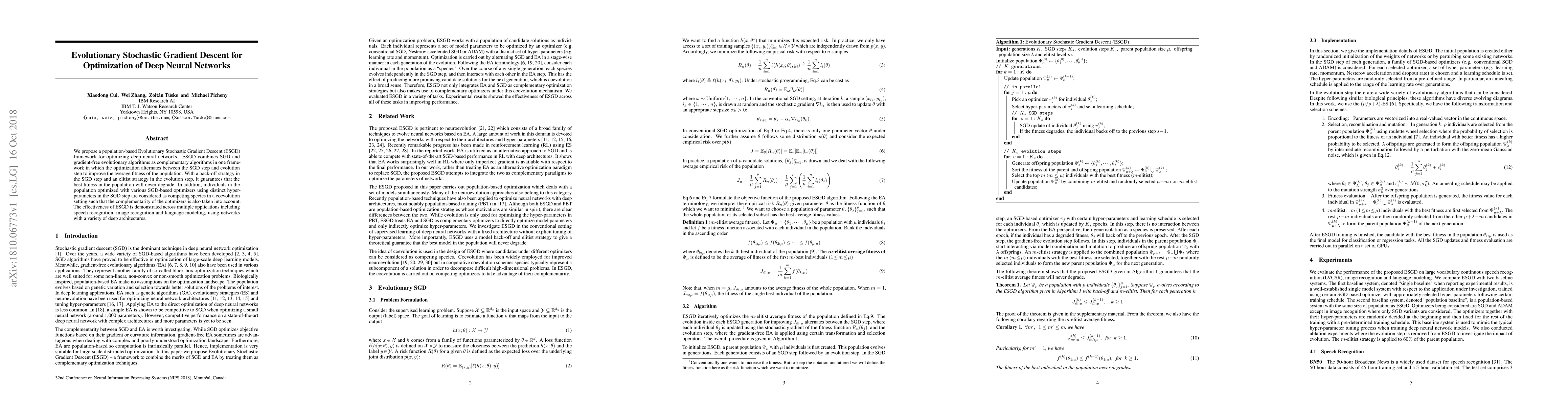 We propose a population-based Evolutionary Stochastic Gradient Descent (ESGD) framework for optimizing deep neural networks. ESGD combines SGD and gradient-free evolutionary algorithms as complementary algorithms in one framework in which the optimization alternates between the SGD step and evolution step to improve the average fitness of the population. With a back-off strategy in the SGD step and an elitist strategy in the evolution step, it guarantees that the best fitness in the population will never degrade. In addition, individuals in the population optimized with various SGD-based optimizers using distinct hyper-parameters in the SGD step are considered as competing species in a coevolution setting such that the complementarity of the optimizers is also taken into account. The effectiveness of ESGD is demonstrated across multiple applications including speech recognition, image recognition and language modeling, using networks with a variety of deep architectures.