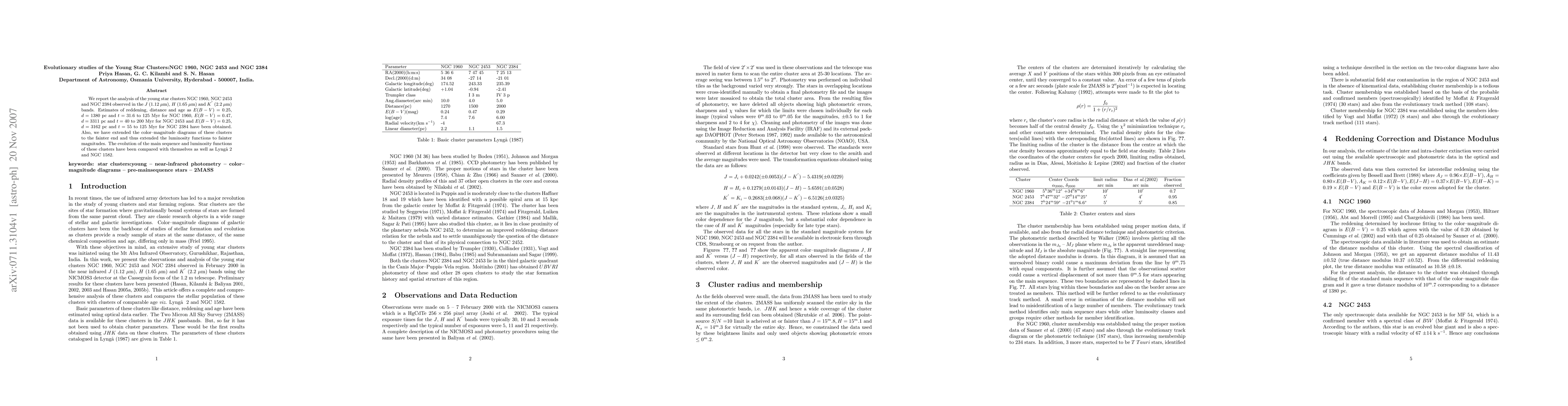 We report the analysis of the young star clusters NGC 1960, NGC 2453 and NGC 2384 observed in the $J$ (1.12 $\mu$m), $H$ (1.65 $\mu$m) and $K^{'}$ (2.2 $\mu$m) bands. Estimates of reddening, distance and age as $E(B-V)=0.25$, $d= 1380$ pc and $t=31.6$ to 125 Myr for NGC 1960, $E(B-V)=0.47$, $d=3311$ pc and $t=40$ to 200 Myr for NGC 2453 and $E(B-V)=0.25$, $d=3162$ pc and $t=55$ to 125 Myr for NGC 2384 have been obtained. Also, we have extended the color--magnitude diagrams of these clusters to the fainter end and thus extended the luminosity functions to fainter magnitudes. The evolution of the main sequence and luminosity functions of these clusters have been compared with themselves as well as Lyng\aa 2 and NGC 1582.